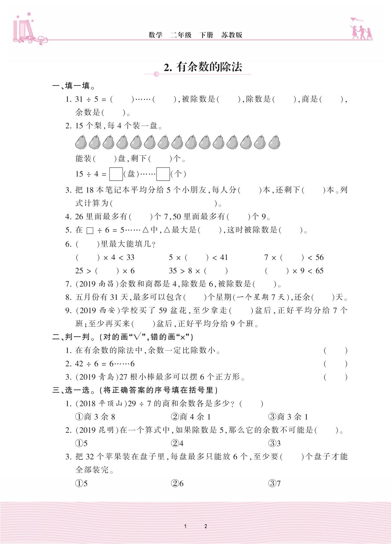2021下册二年级数学苏教版 九 期末复习——2. 有余数的除法