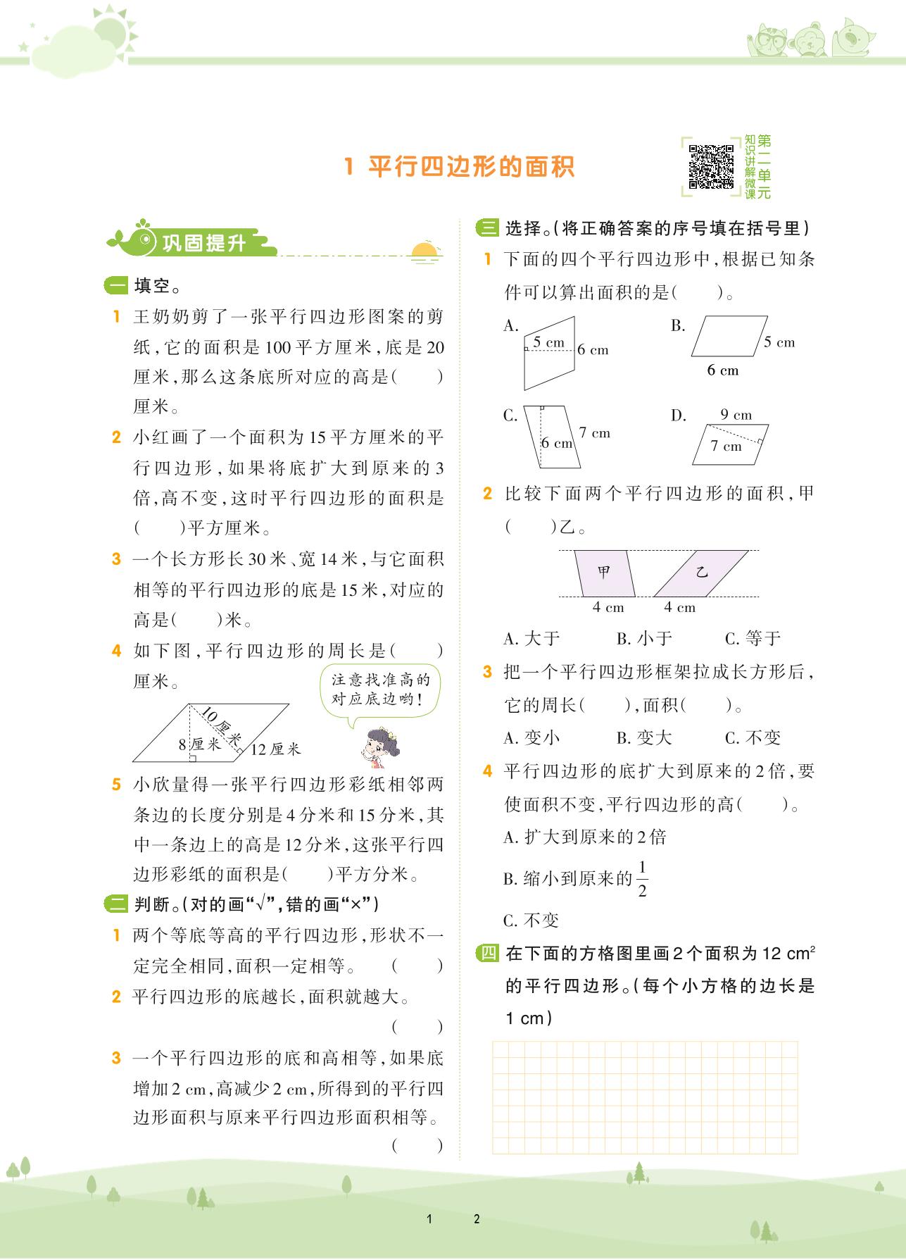 2020上册五年级数学苏教版 第二单元 多边形的面积——1 平行四边形的面积