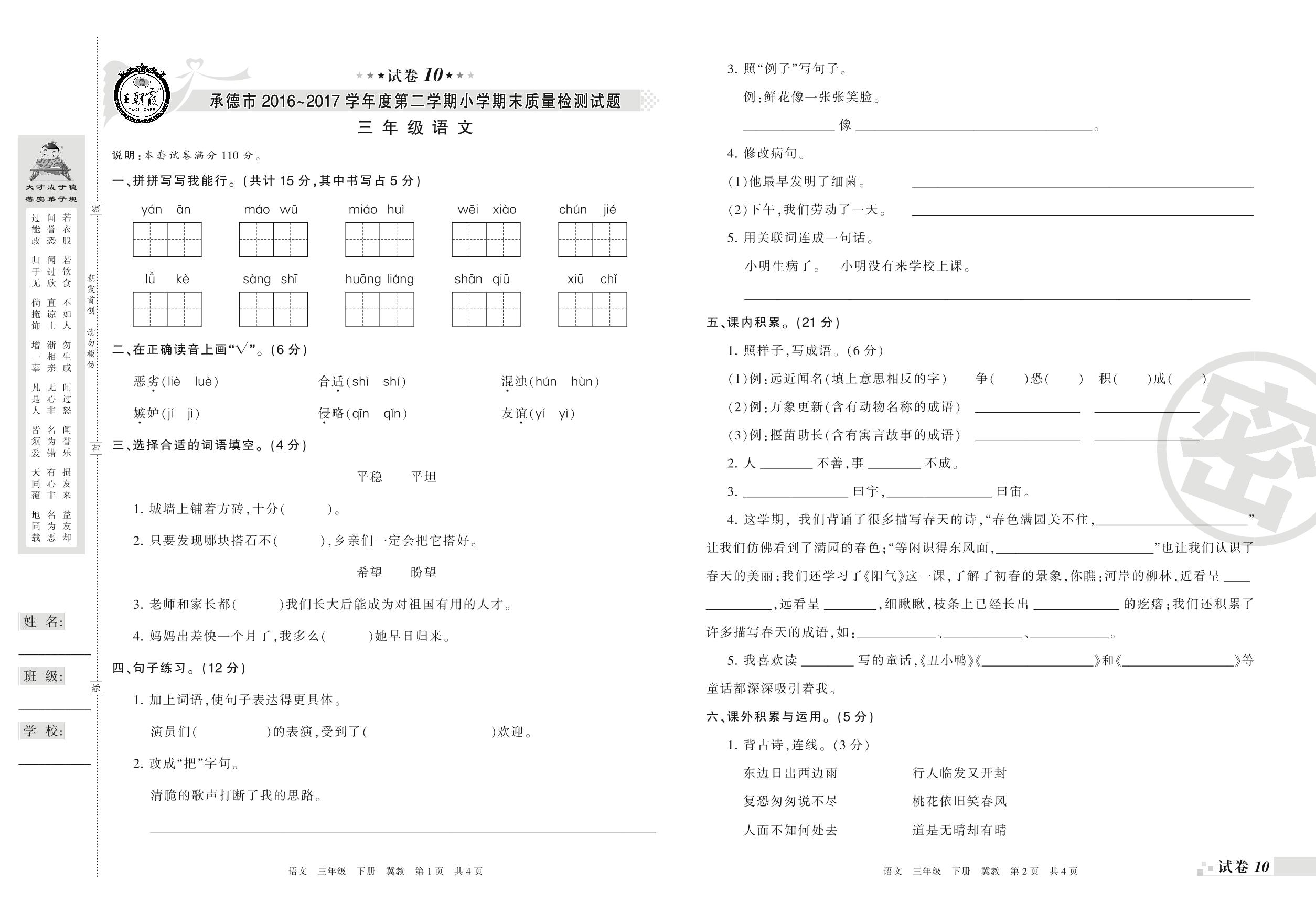 2016-2017学年第二学期承德市三年级语文试卷(冀教版)【10】
