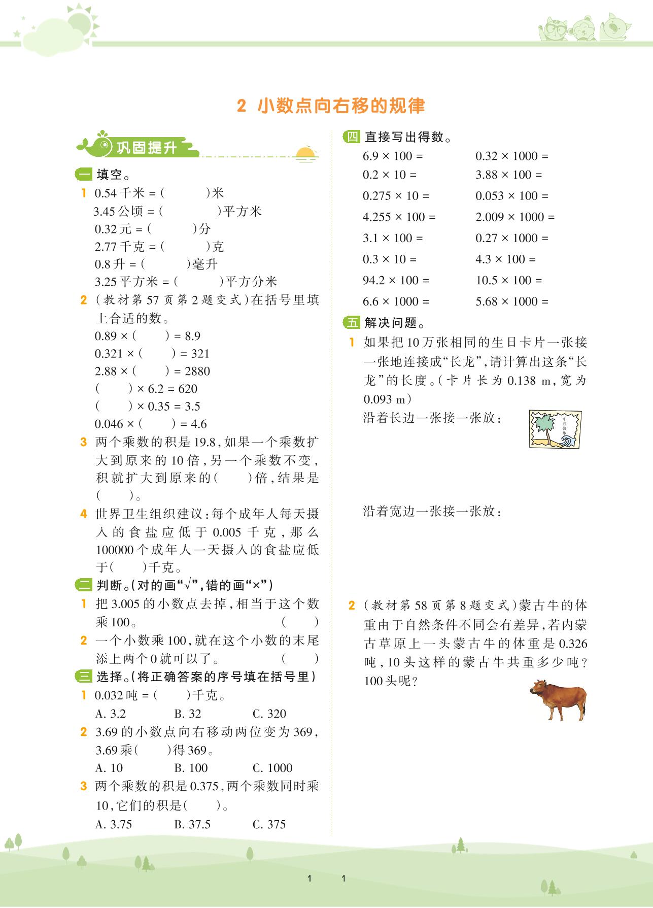 2020上册五年级数学苏教版 第五单元 小数乘法和除法——2 小数点向右移的规律