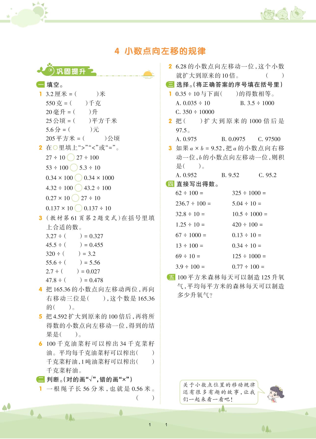 2020上册五年级数学苏教版 第五单元 小数乘法和除法——4 小数点向左移的规律