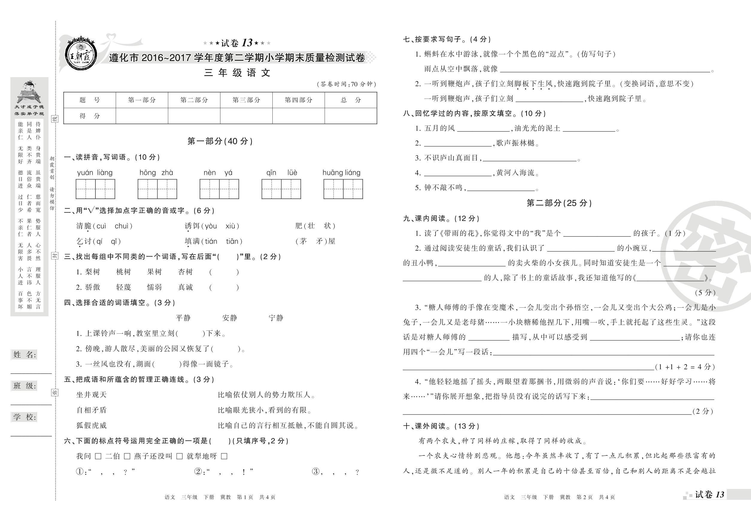 2016-2017学年第二学期遵化市三年级语文试卷(冀教版)【13】