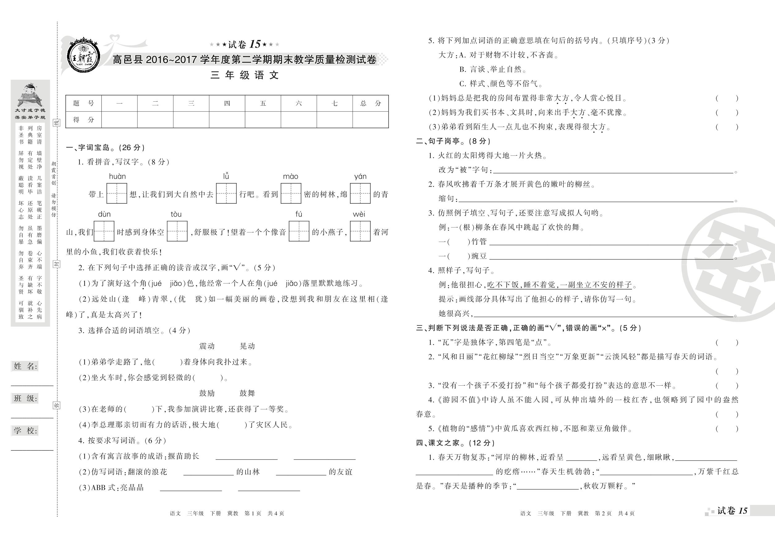2016-2017学年第二学期石家庄市高邑县三年级语文试卷(冀教版)【15】