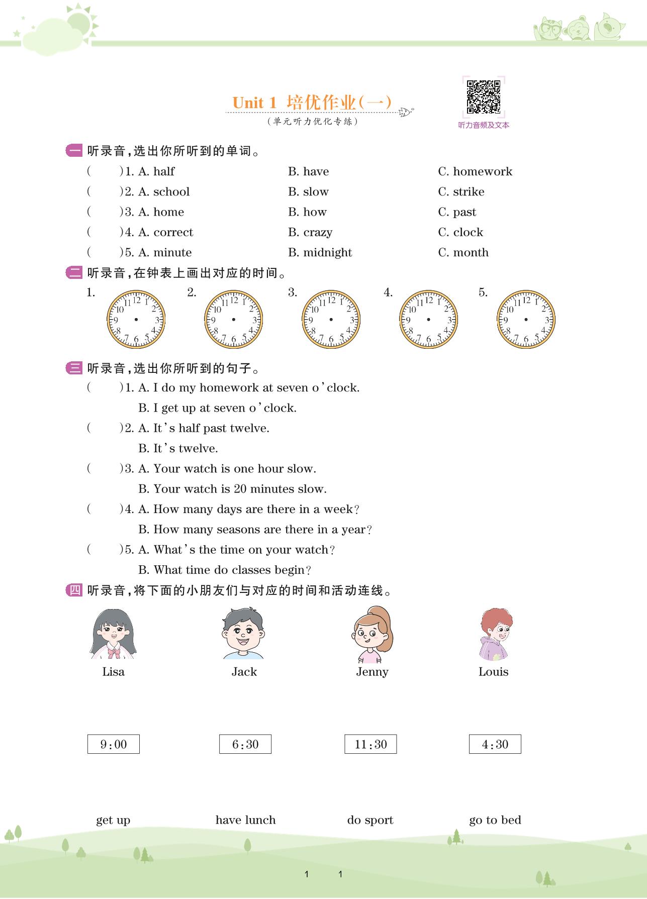 2021下册四年级英语剑桥版 Unit 1 培优作业(一)