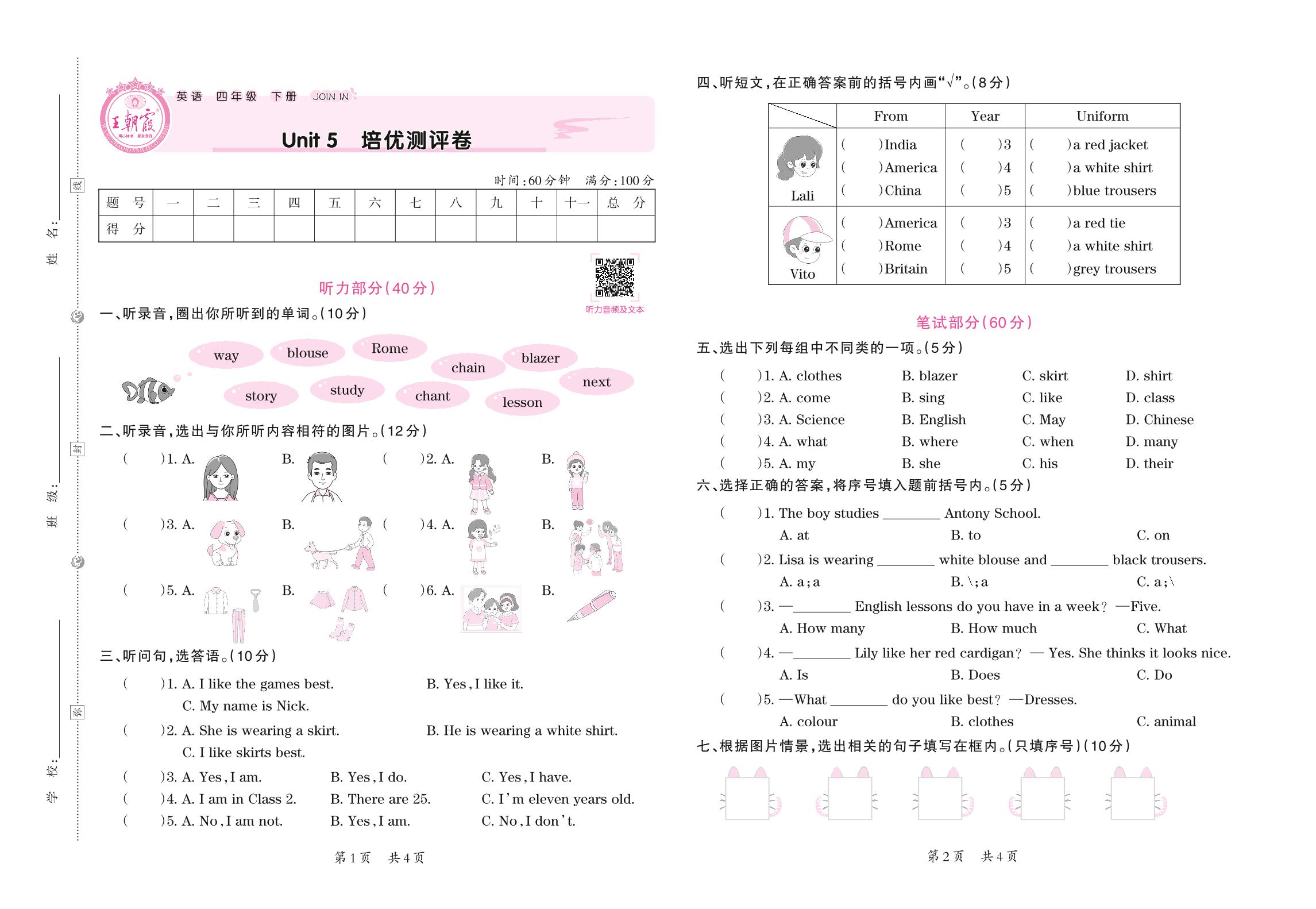 四年级英语剑桥版下册单元卷