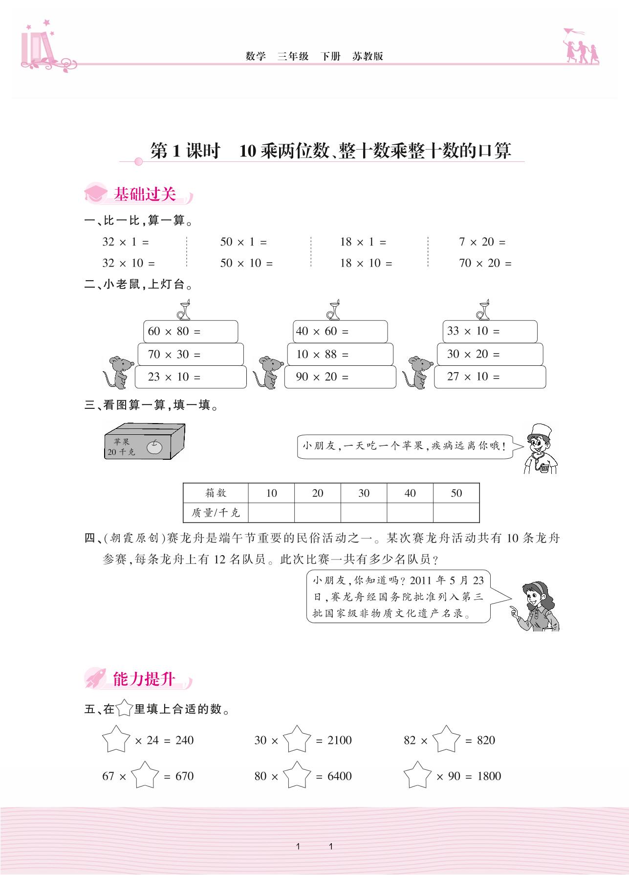 2021下册三年级数学苏教版 一 两位数乘两位数——第1课时 10乘两位数、整十数乘整十数的口算