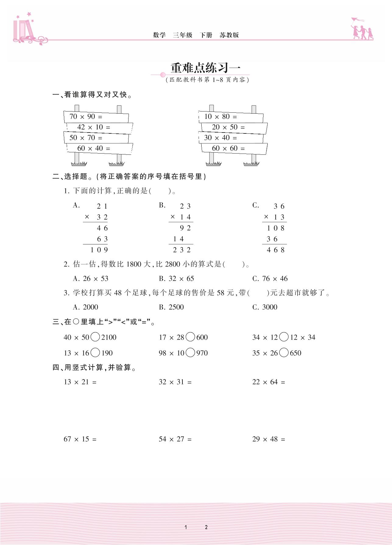 2021下册三年级数学苏教版 一 两位数乘两位数——重难点练习一
