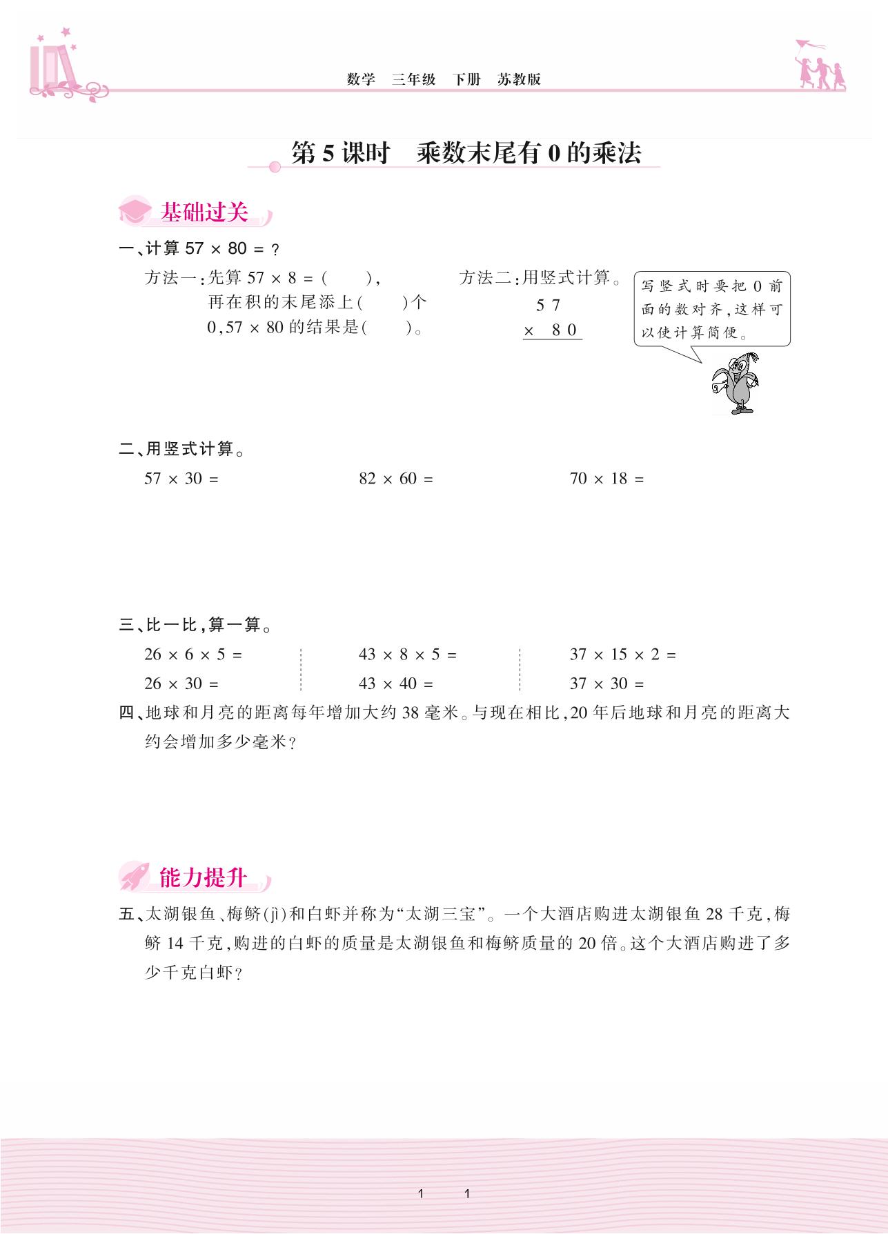 2021下册三年级数学苏教版 一 两位数乘两位数——第5课时 乘数末尾有0的乘法