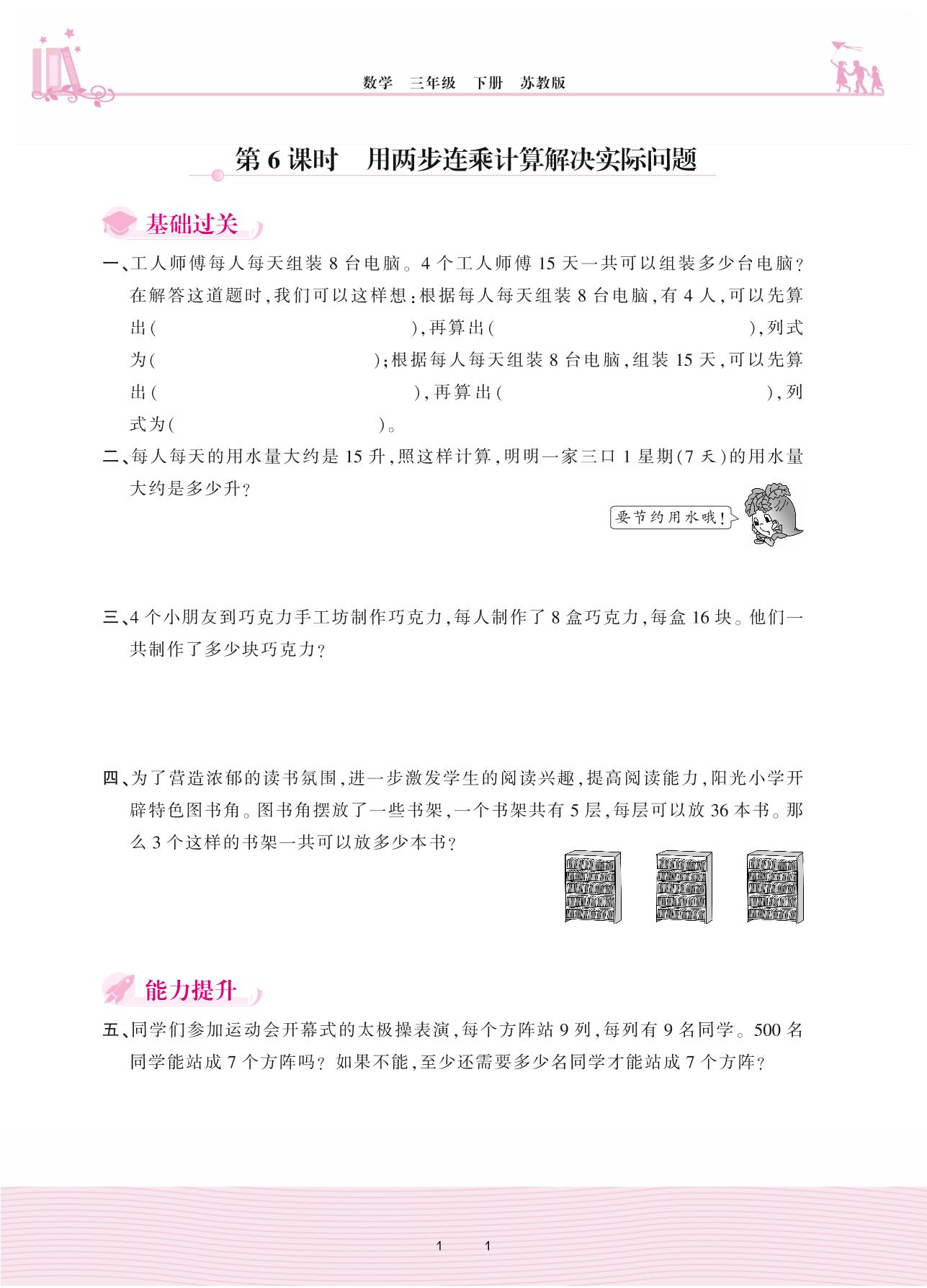 2021下册三年级数学苏教版 一 两位数乘两位数——第6课时 用两步连乘计算解决实际问题