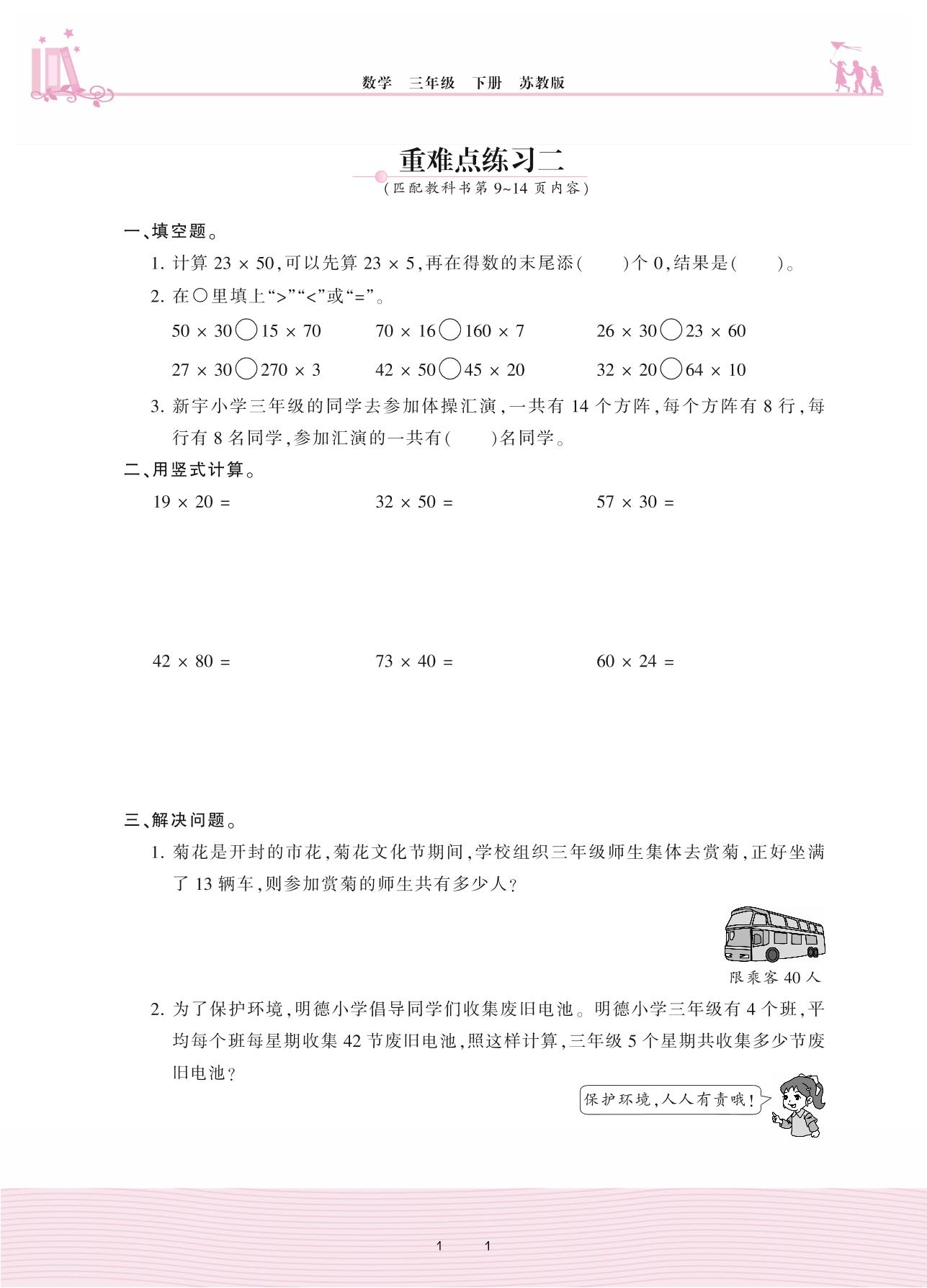 2021下册三年级数学苏教版 一 两位数乘两位数——重难点练习二