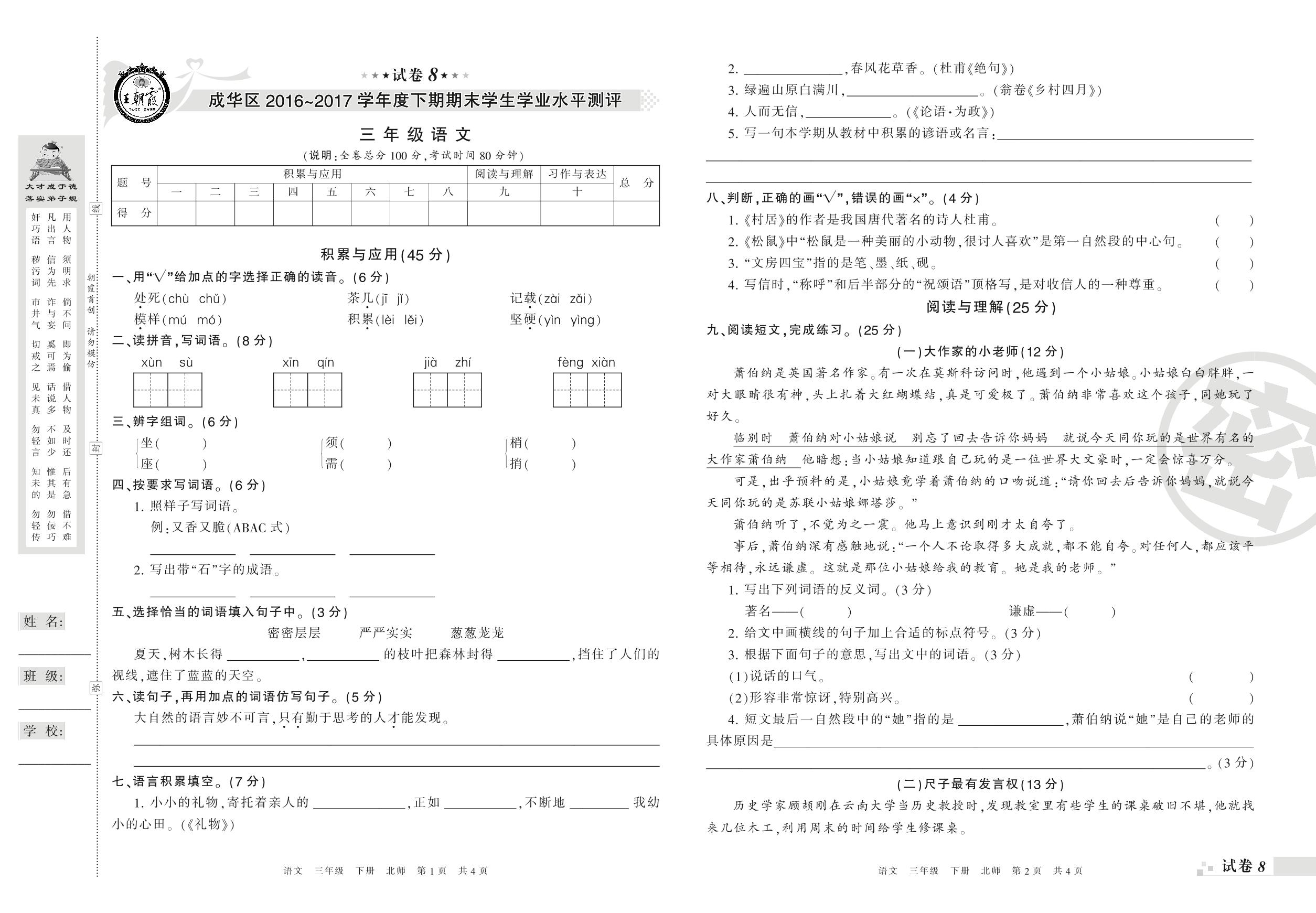 2016-2017学年第二学期成都市成华区三年级语文试卷(北师版)【8】