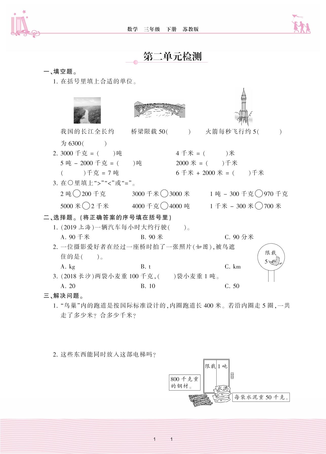 2021下册三年级数学苏教版 二 千米和吨 ——第二单元检测