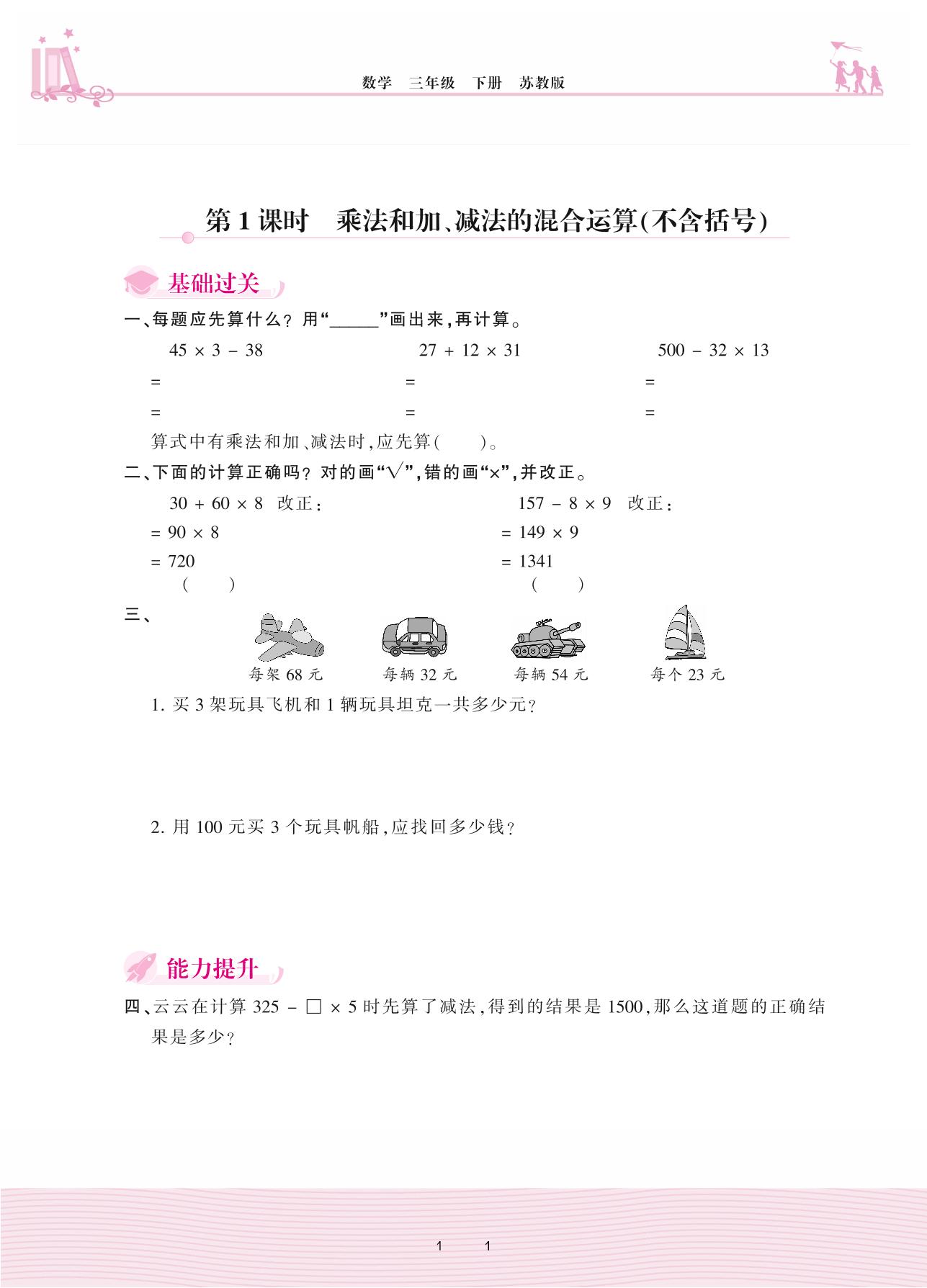 2021下册三年级数学苏教版 四 混合运算——第1课时 乘法和加、减法的混合运算(不含括号)