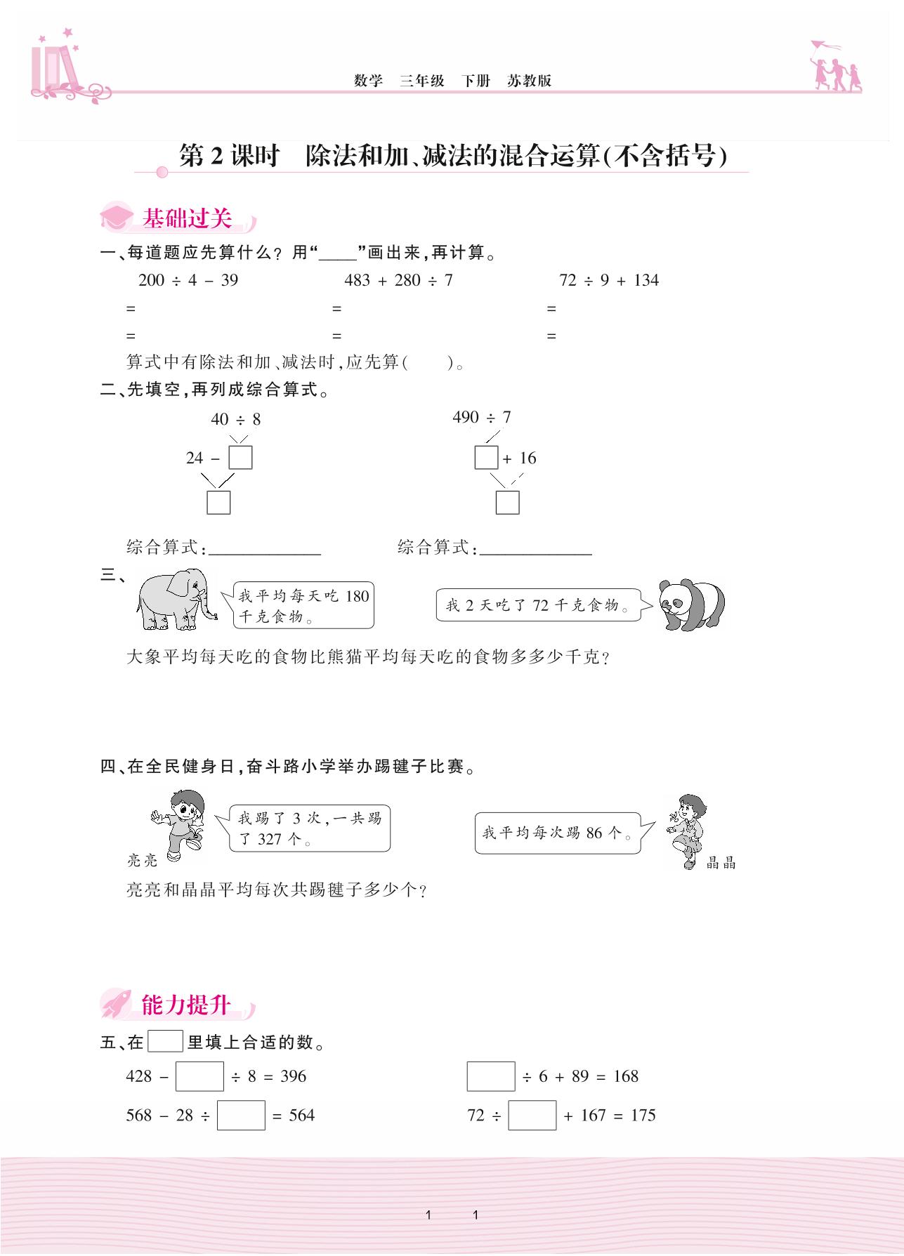 2021下册三年级数学苏教版 四 混合运算——第2课时 除法和加、减法的混合运算(不含括号)