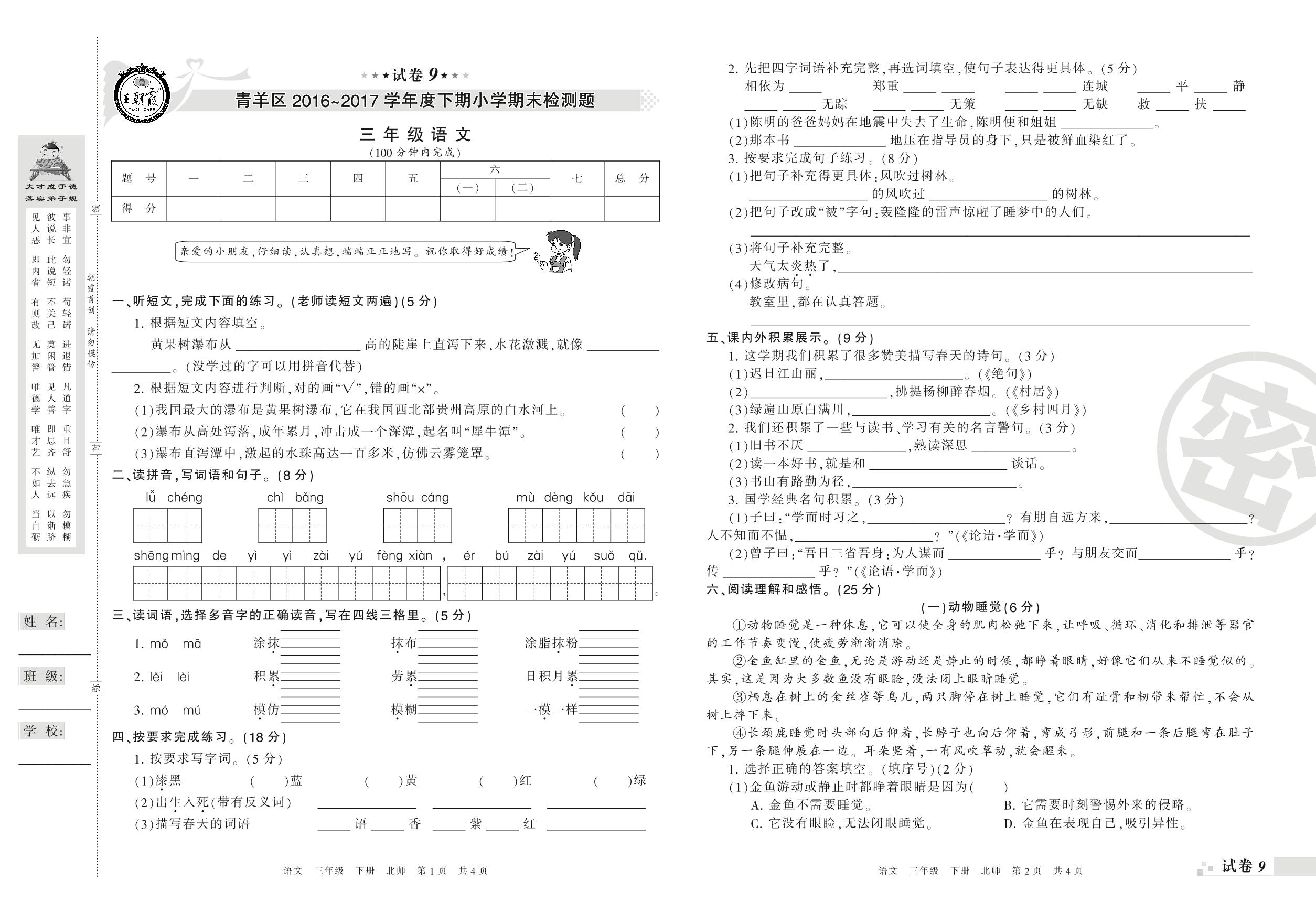 2016-2017学年第二学期成都市青羊区三年级语文试卷(北师版)【9】