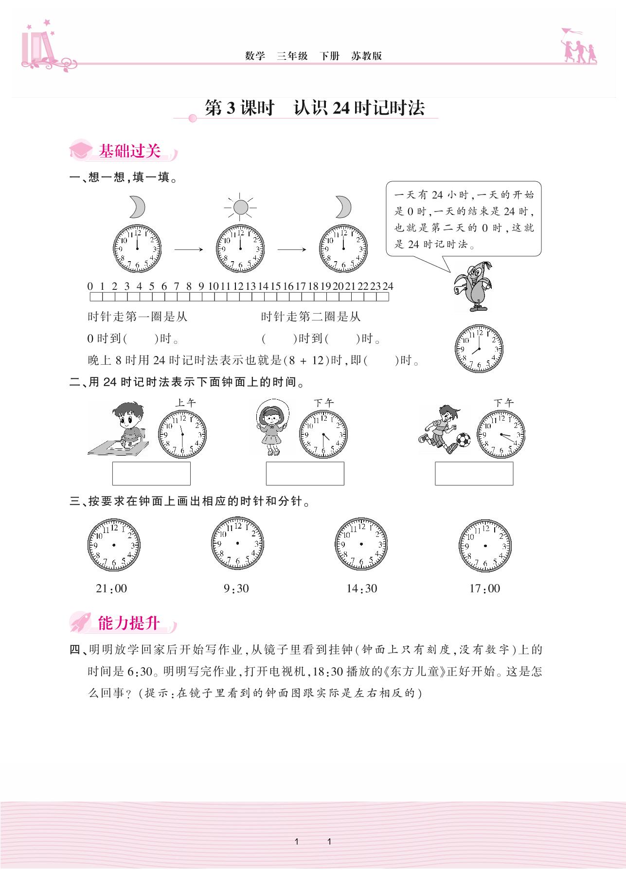 2021下册三年级数学苏教版 五 年、月、日——第3课时 认识24时记时法