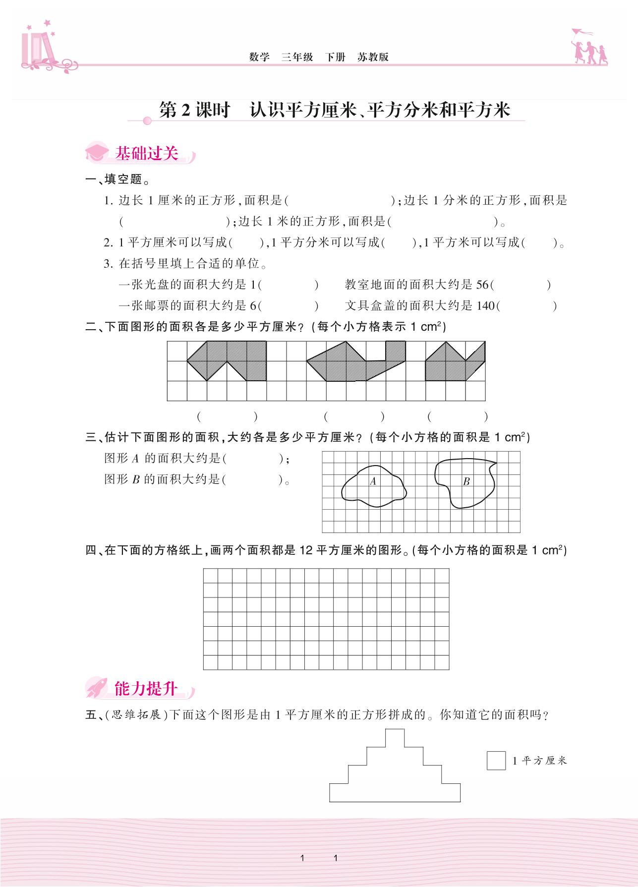 2021下册三年级数学苏教版 六 长方形和正方形的面积——第2课时 认识平方厘米、平方分米和平方米