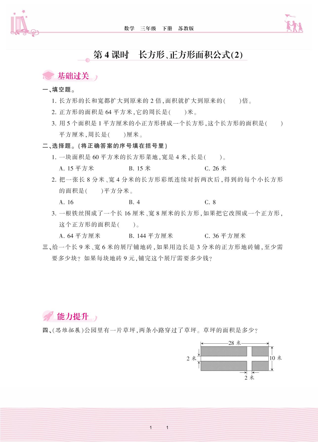 2021下册三年级数学苏教版 六 长方形和正方形的面积——第4课时 长方形、正方形面积公式(2)