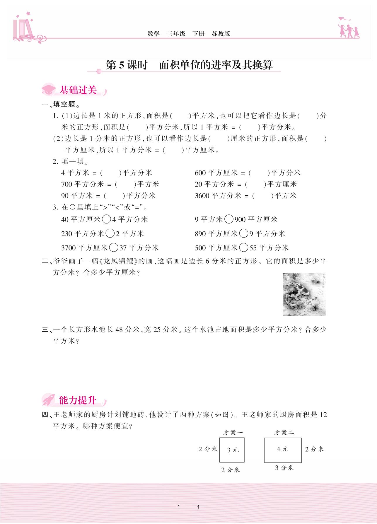 2021下册三年级数学苏教版 六 长方形和正方形的面积——第5课时 面积单位的进率及其换算