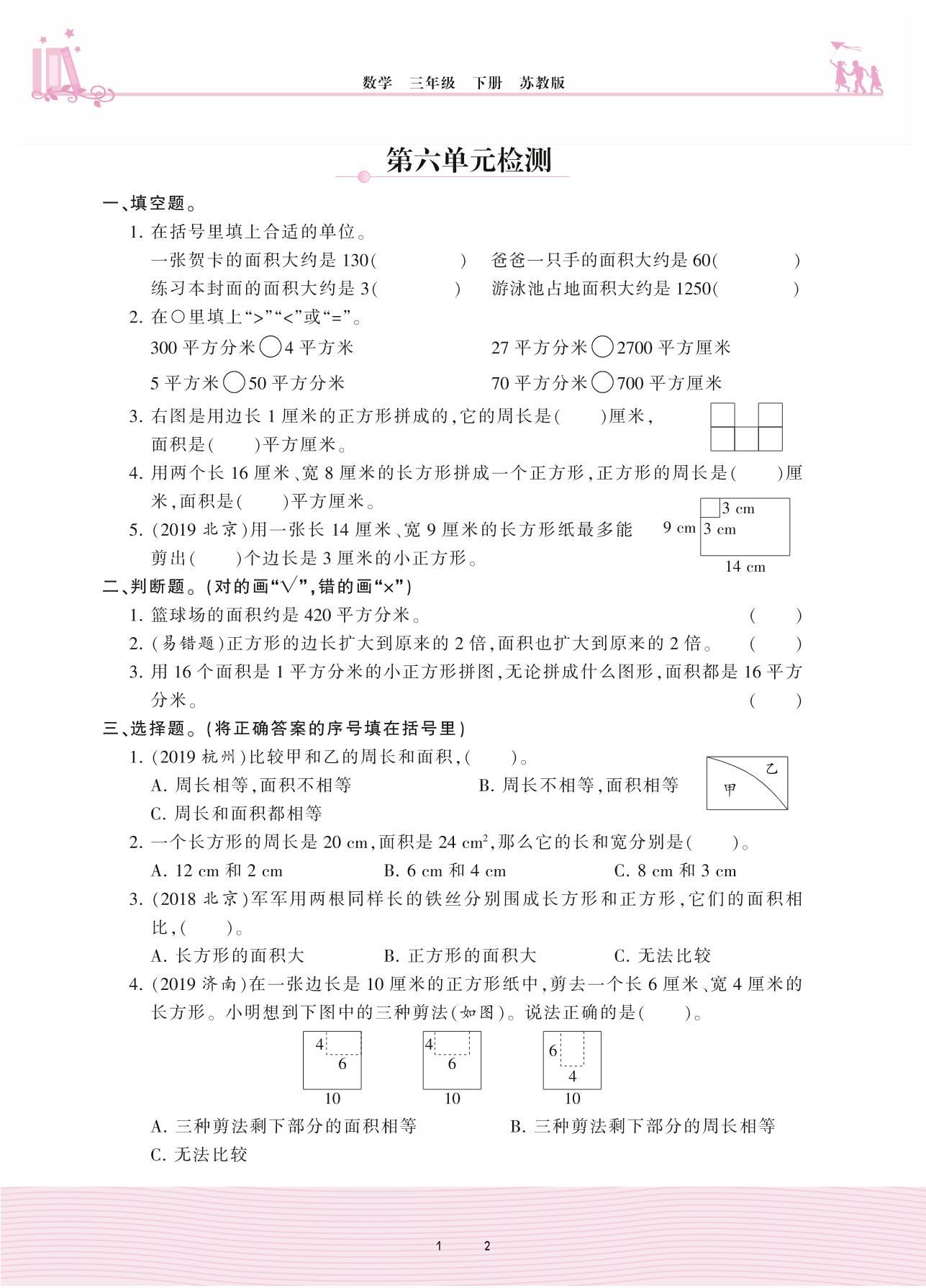 2021下册三年级数学苏教版 六 长方形和正方形的面积——第六单元检测