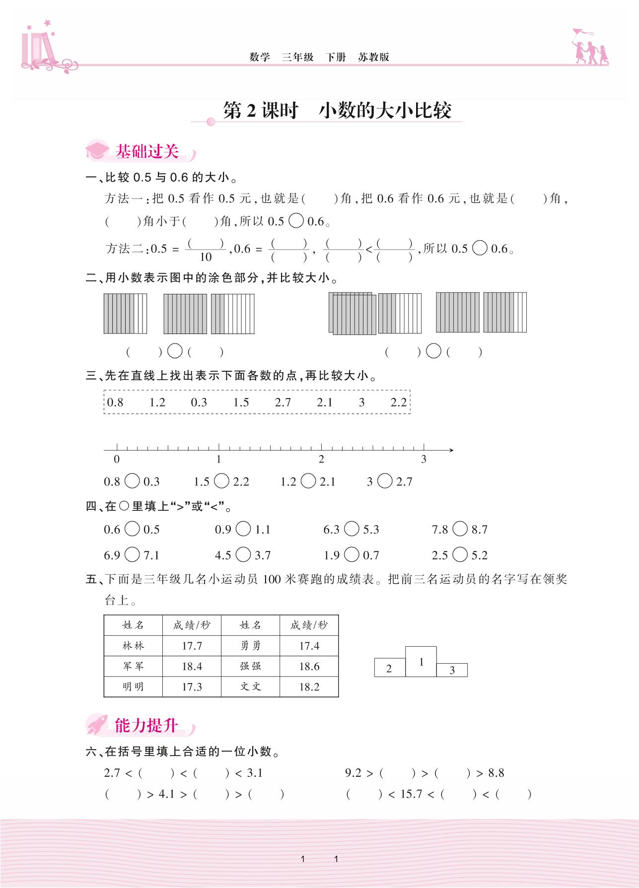 2021下册三年级数学苏教版 八 小数的初步认识——第2课时 小数的大小比较