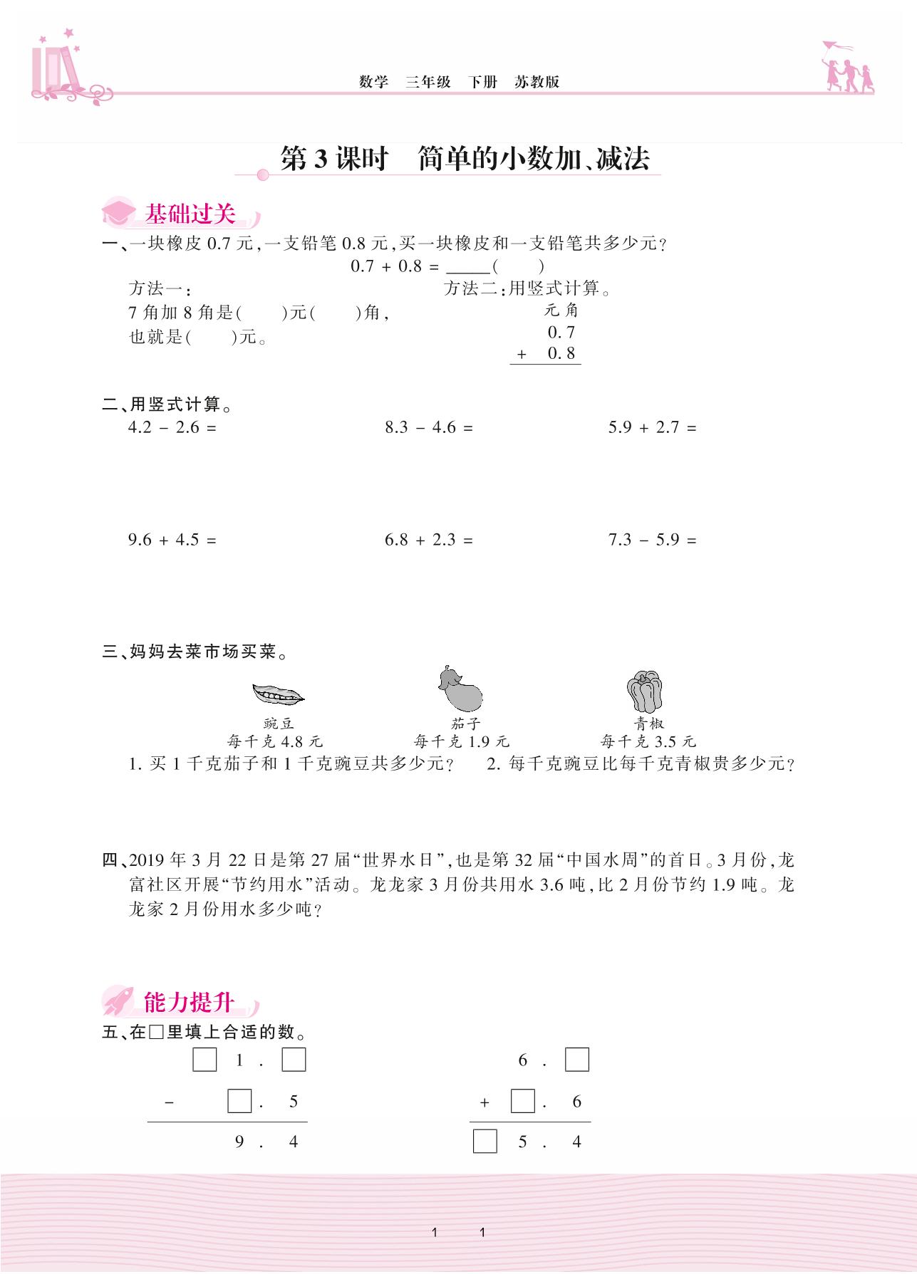 2021下册三年级数学苏教版 八 小数的初步认识——第3课时 简单的小数加、减法