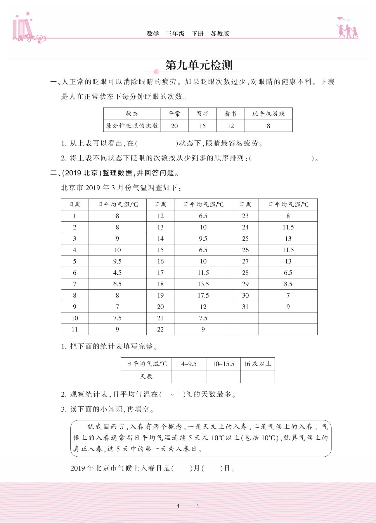 2021下册三年级数学苏教版 九 数据的收集和整理(二) ——第九单元检测
