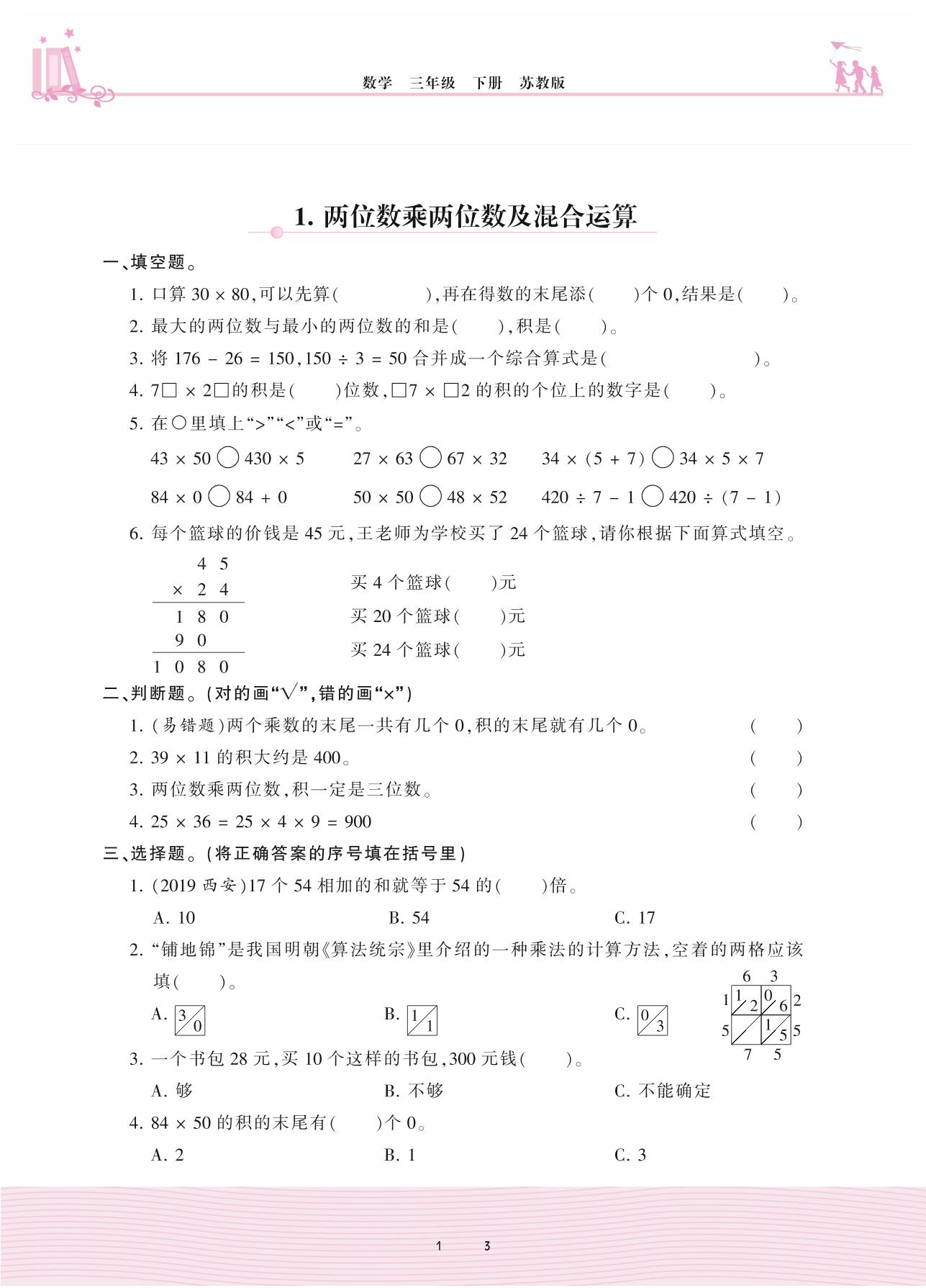 2021下册三年级数学苏教版 十 期末复习——1. 两位数乘两位数及混合运算