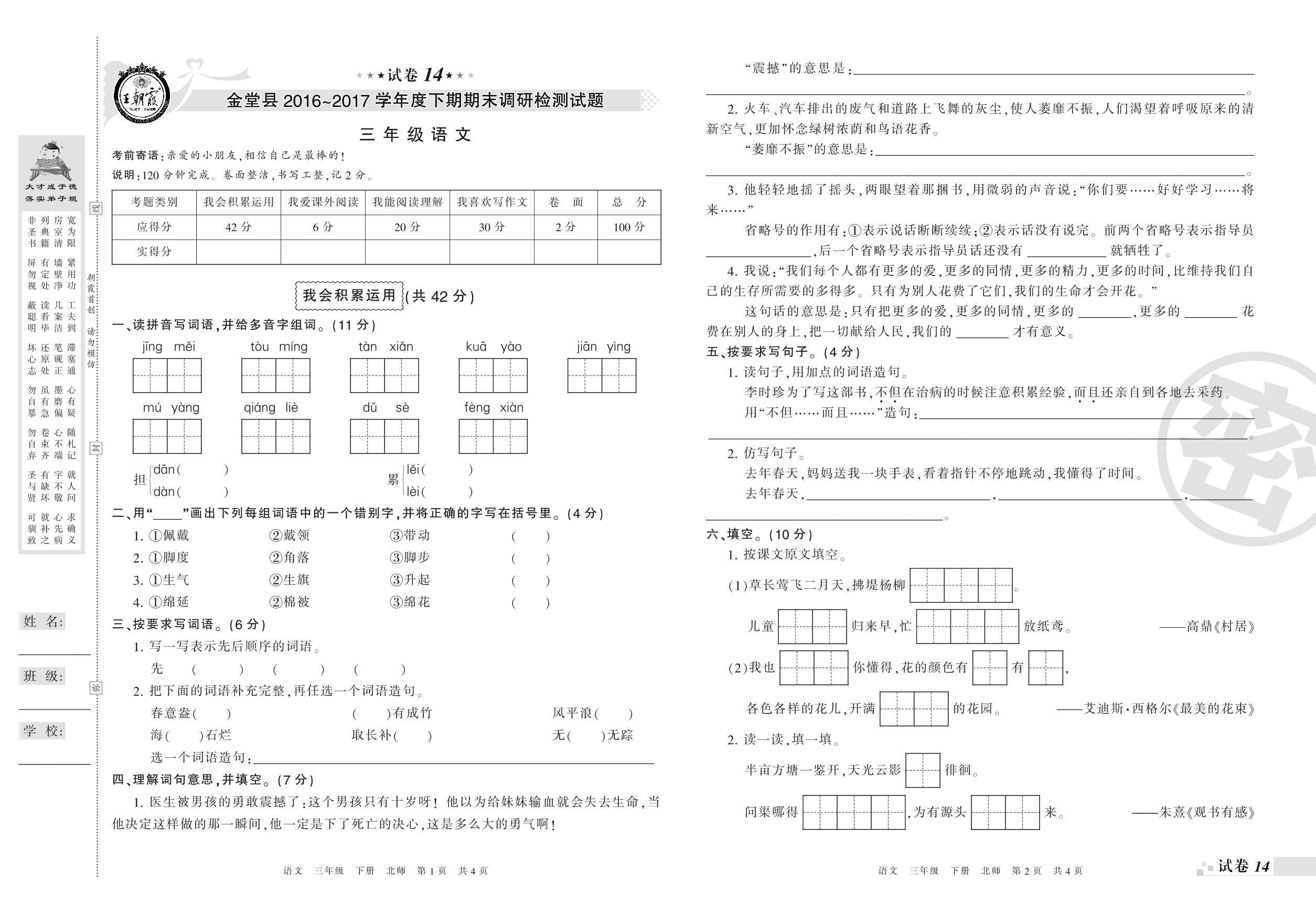 2016-2017学年第二学期成都市金堂县三年级语文试卷(北师版)【14】