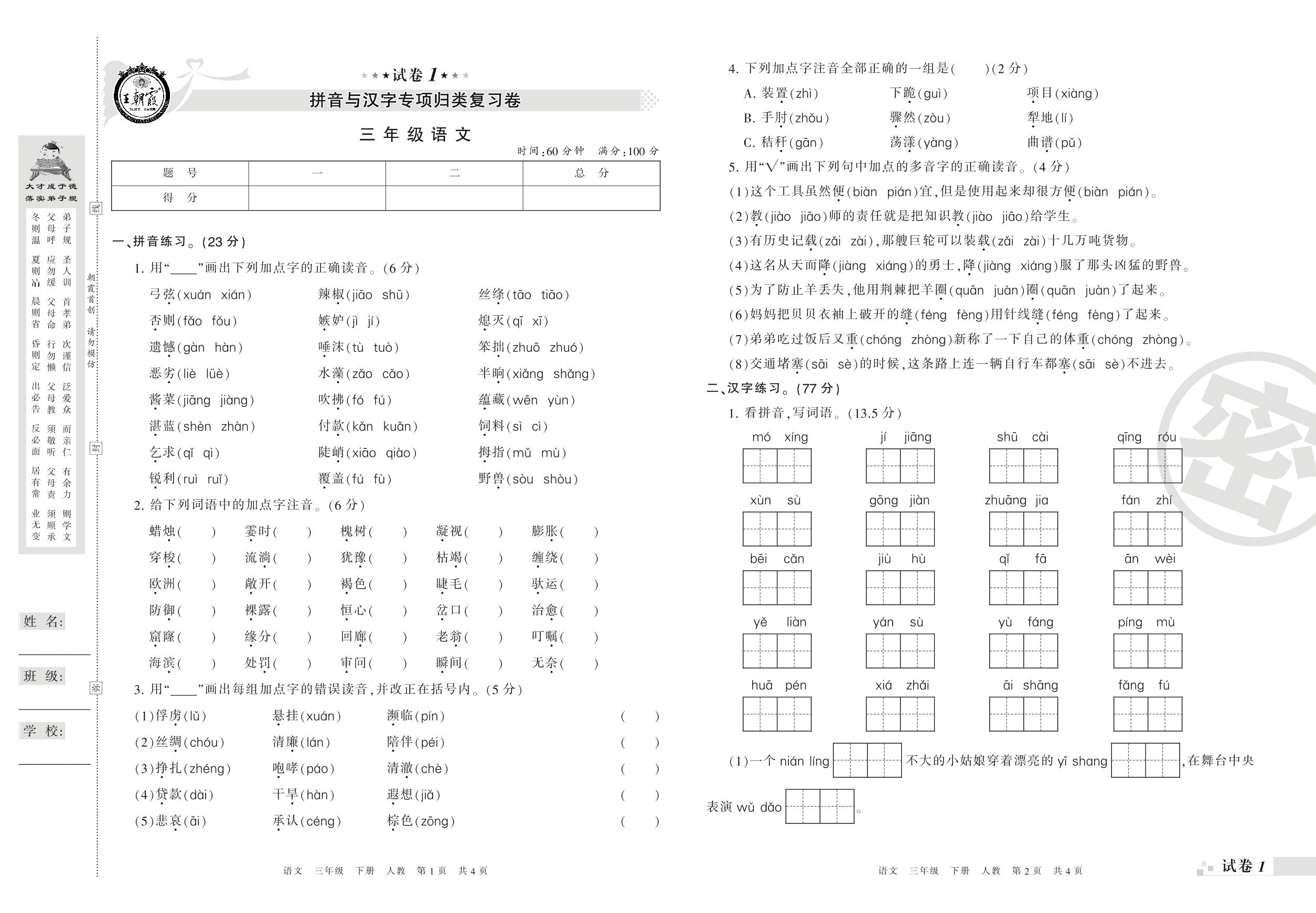 王朝霞期末专项卷——拼音与汉字专项归类复习卷三年级下册语文(人教版)_R210801105115【1】