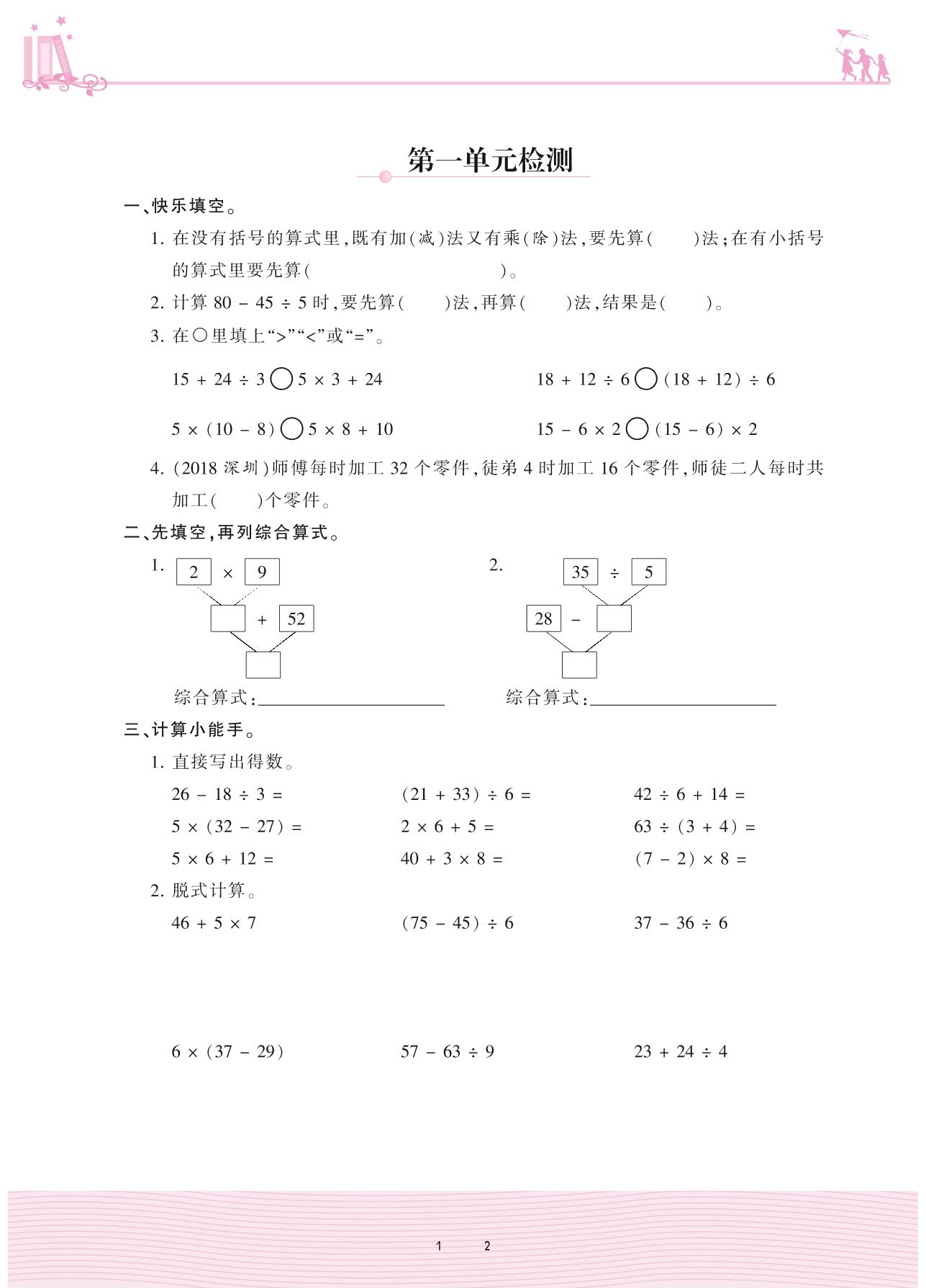 2020上册三年级数学北师版 一 混合运算——第一单元检测