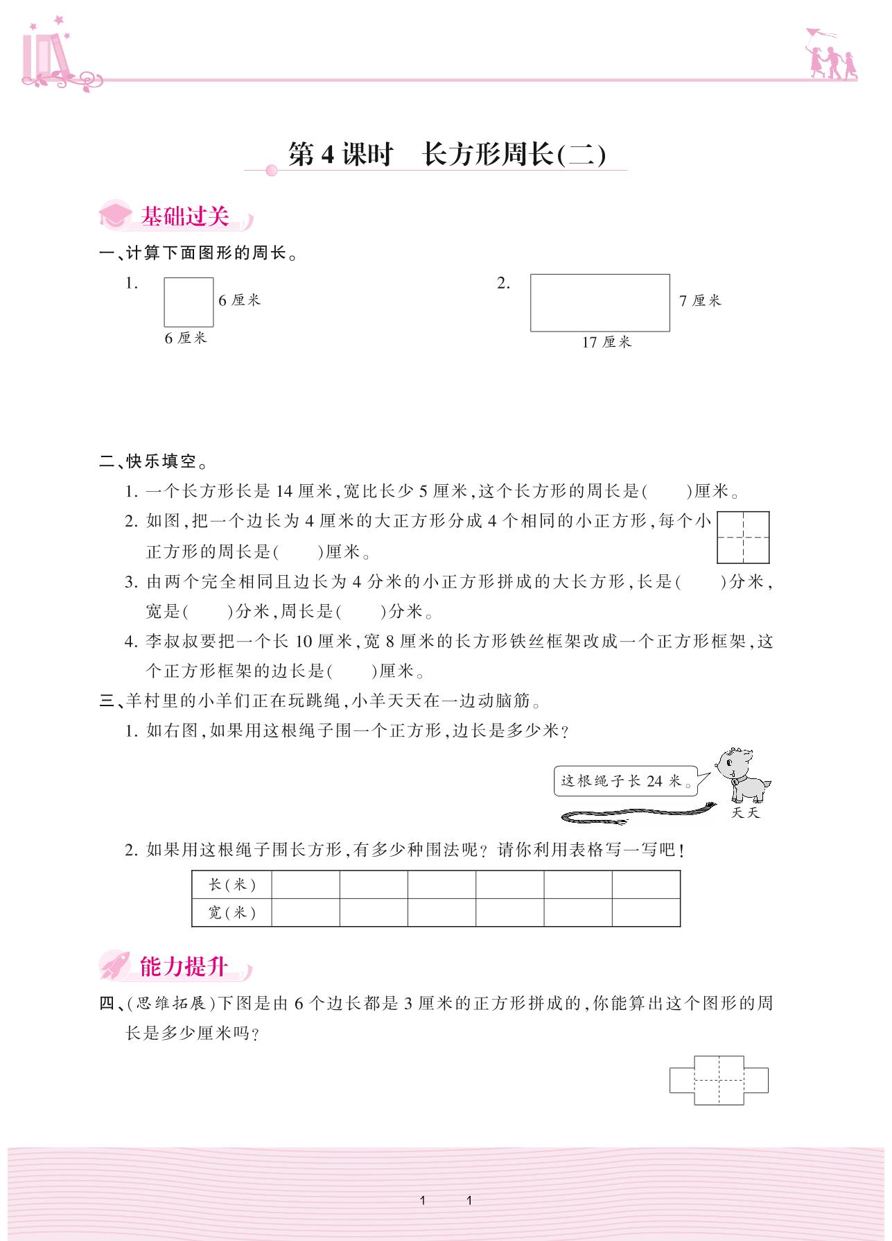 2020上册三年级数学北师版 五 周长——第4课时 长方形周长(二)
