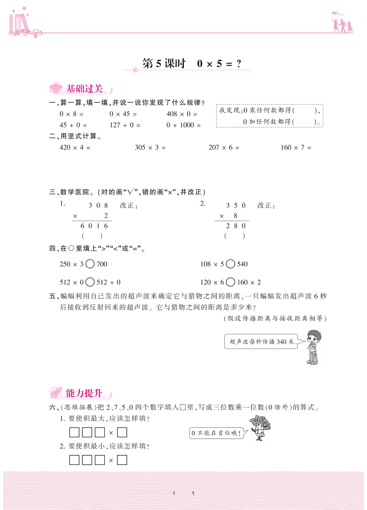 2020上册三年级数学北师版 六 乘法——第5课时 0 × 5 = ?