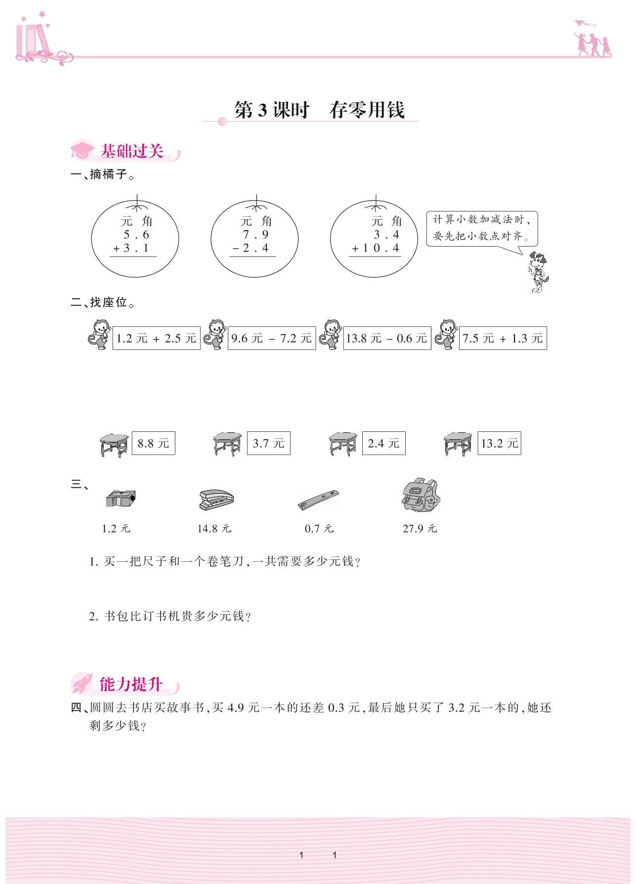 2020上册三年级数学北师版 八 认识小数——第3课时 存零用钱