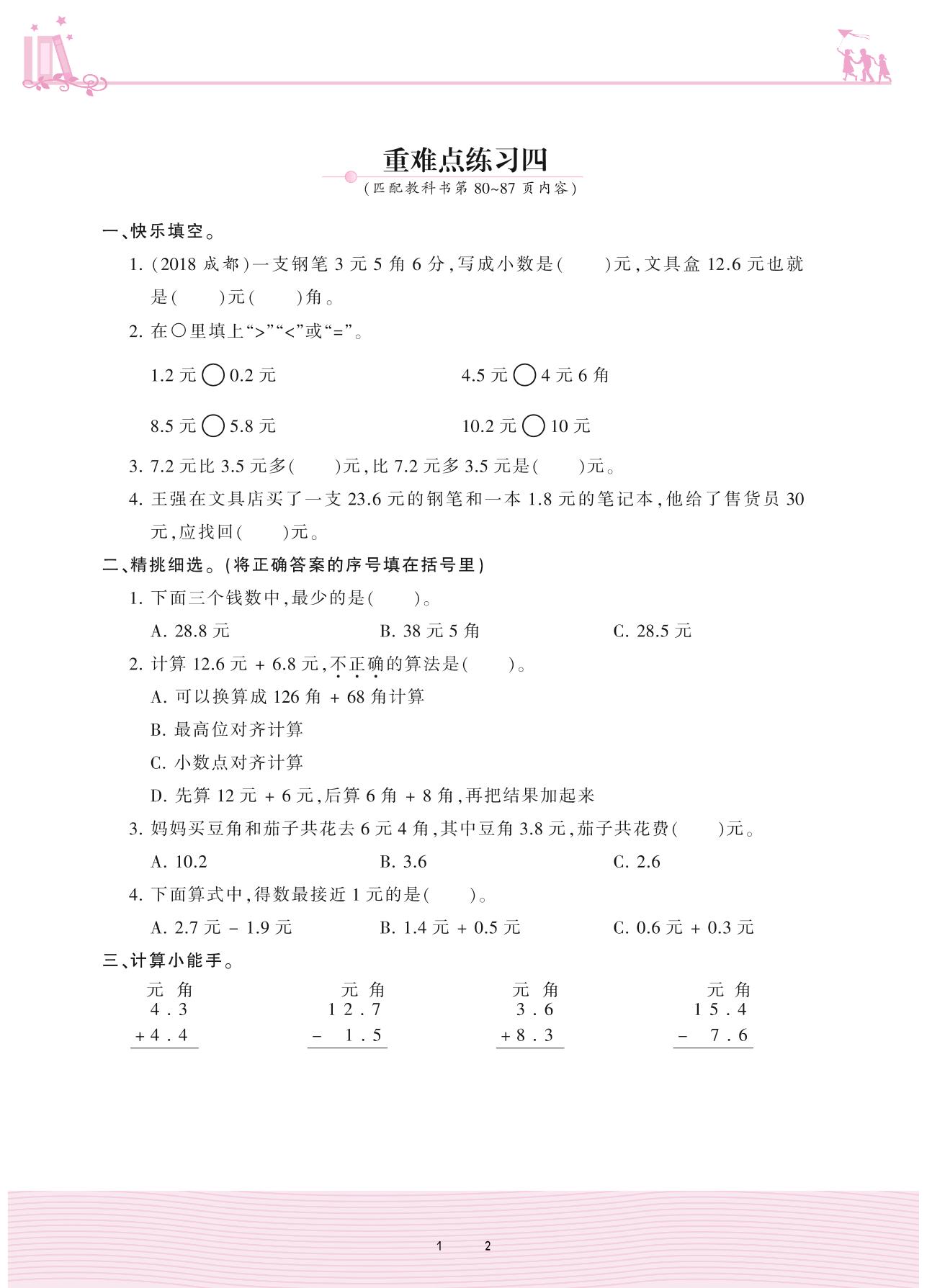 2020上册三年级数学北师版 八 认识小数——重难点练习四