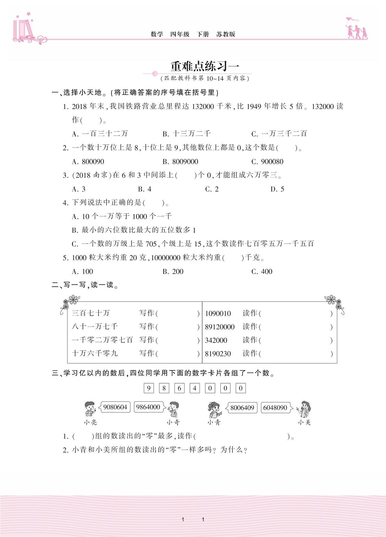 2021下册四年级数学苏教版 二 认识多位数——重难点练习一