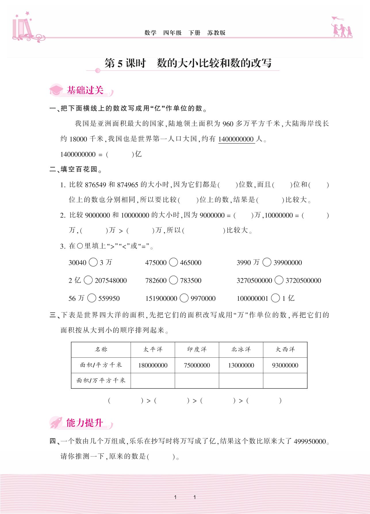 2021下册四年级数学苏教版 二 认识多位数——第5课时 数的大小比较和数的改写