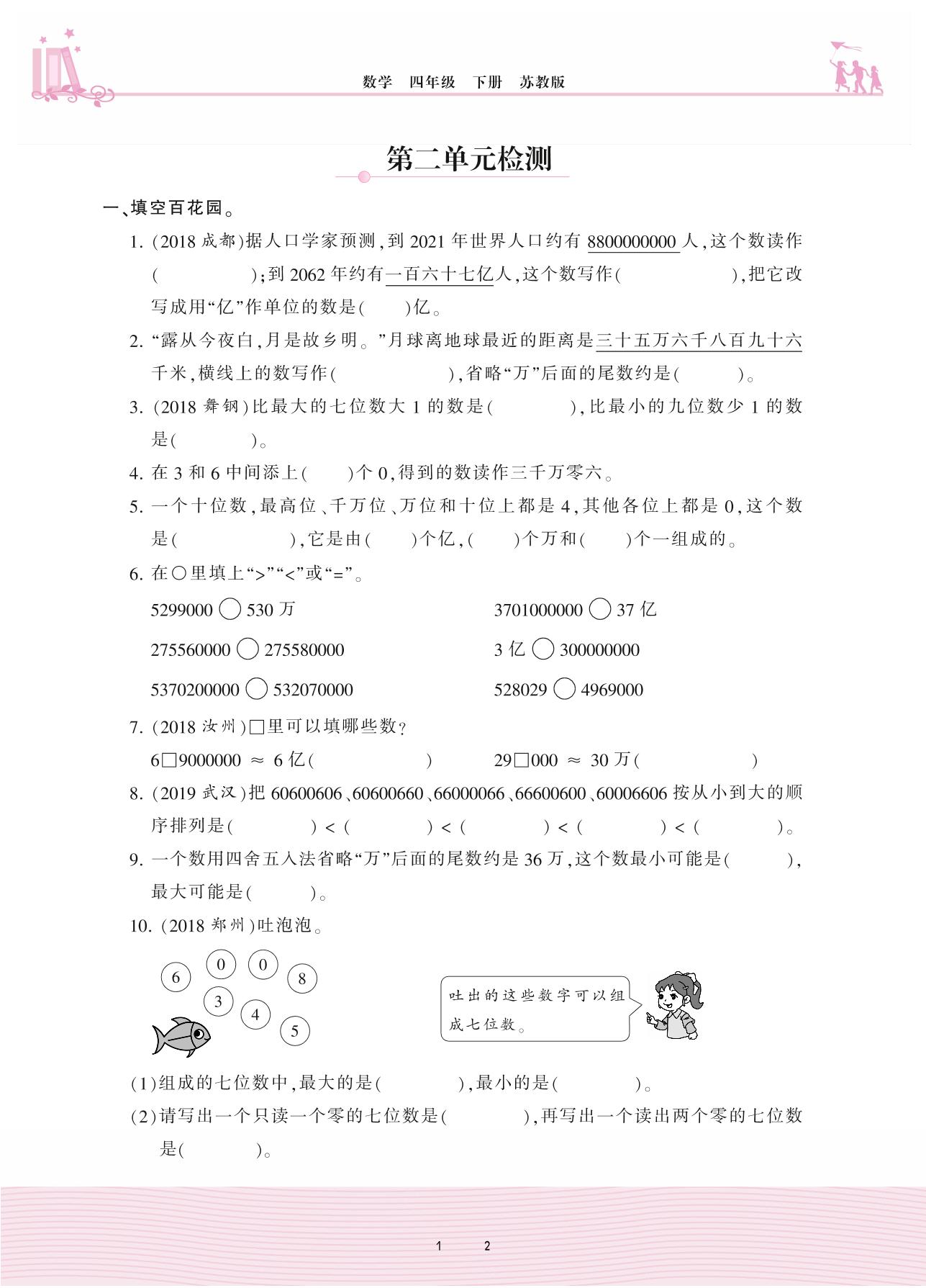 2021下册四年级数学苏教版 二 认识多位数——第二单元检测