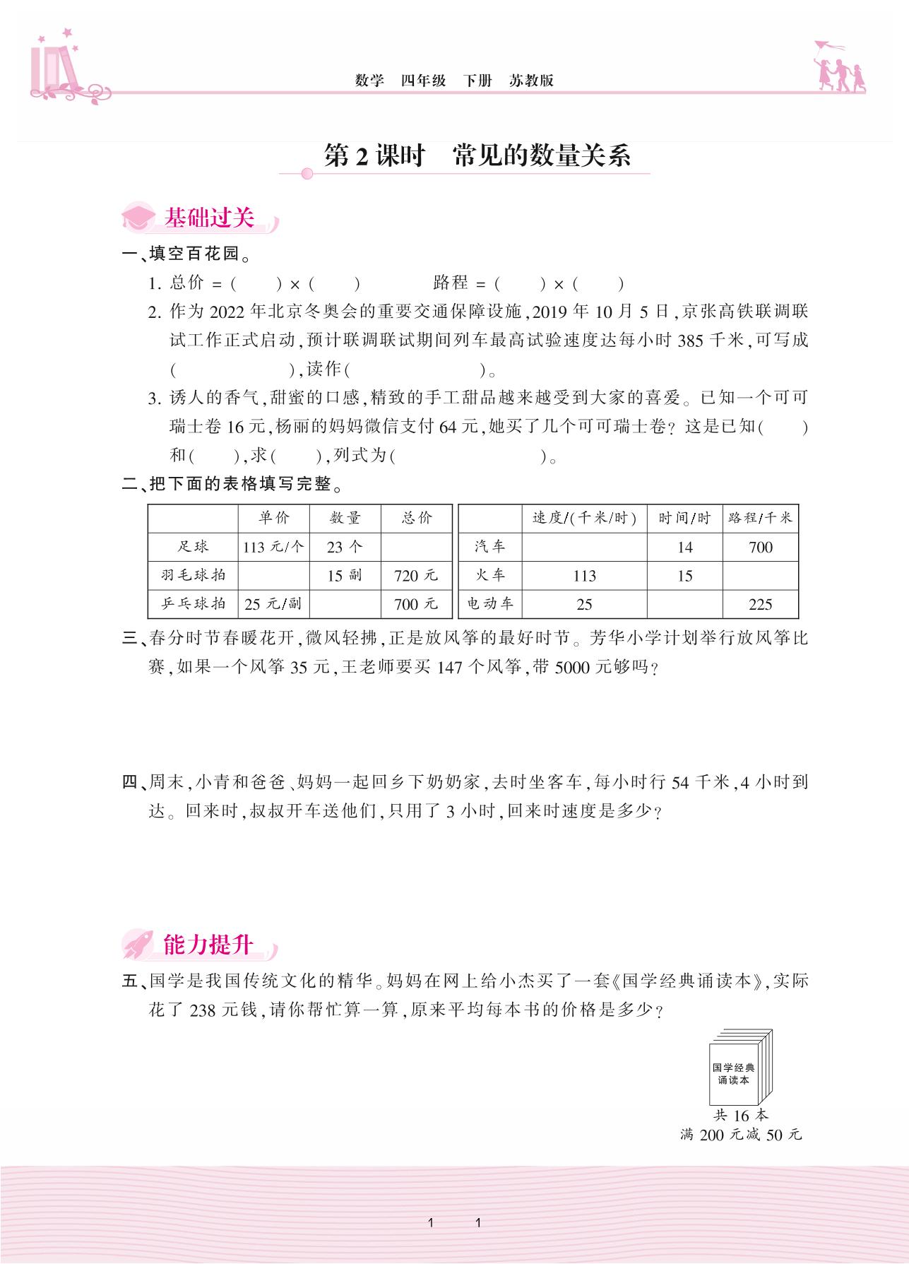2021下册四年级数学苏教版 三 三位数乘两位数——第2课时 常见的数量关系