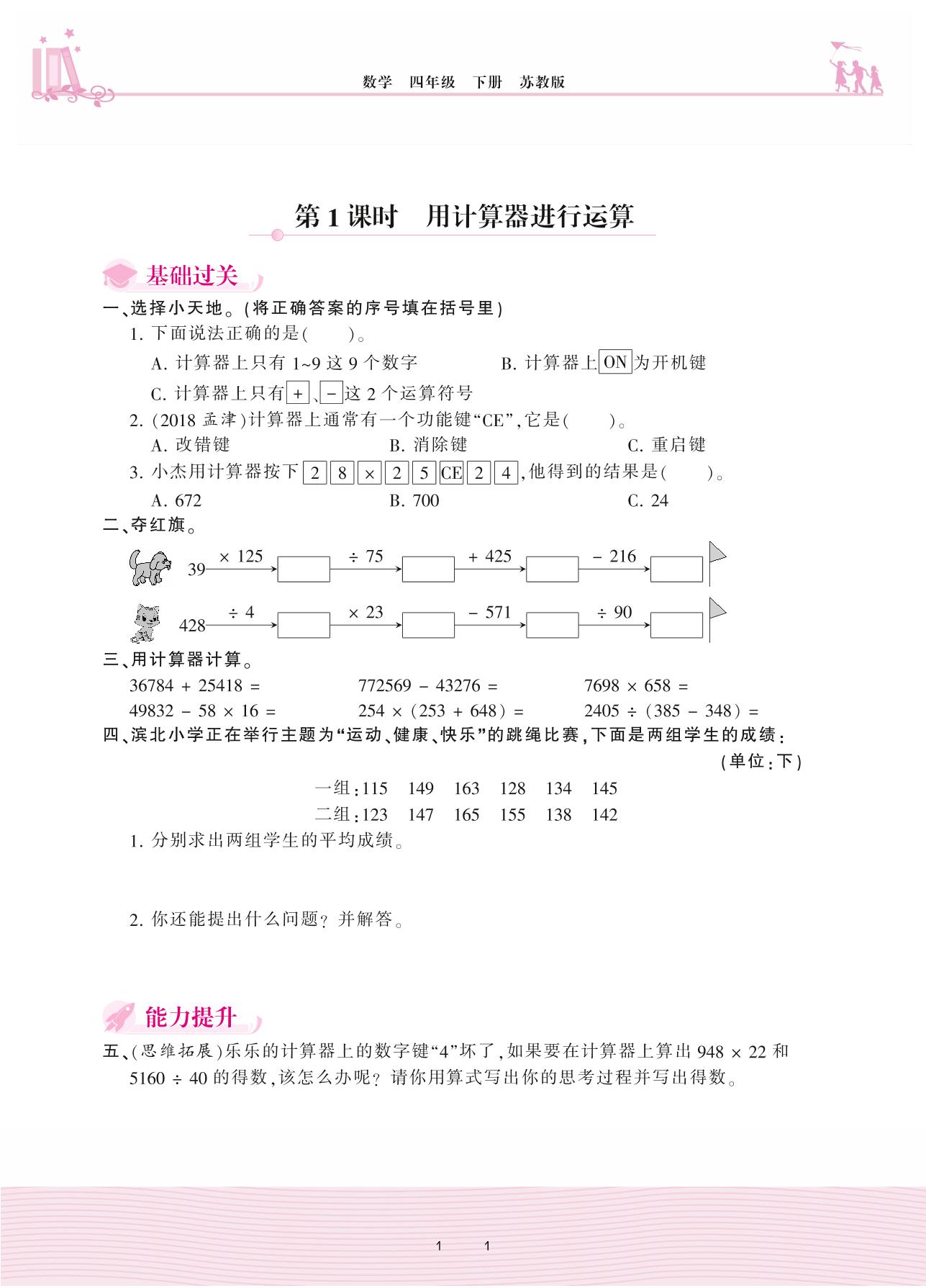 2021下册四年级数学苏教版 四 用计算器计算——第1课时 用计算器进行运算