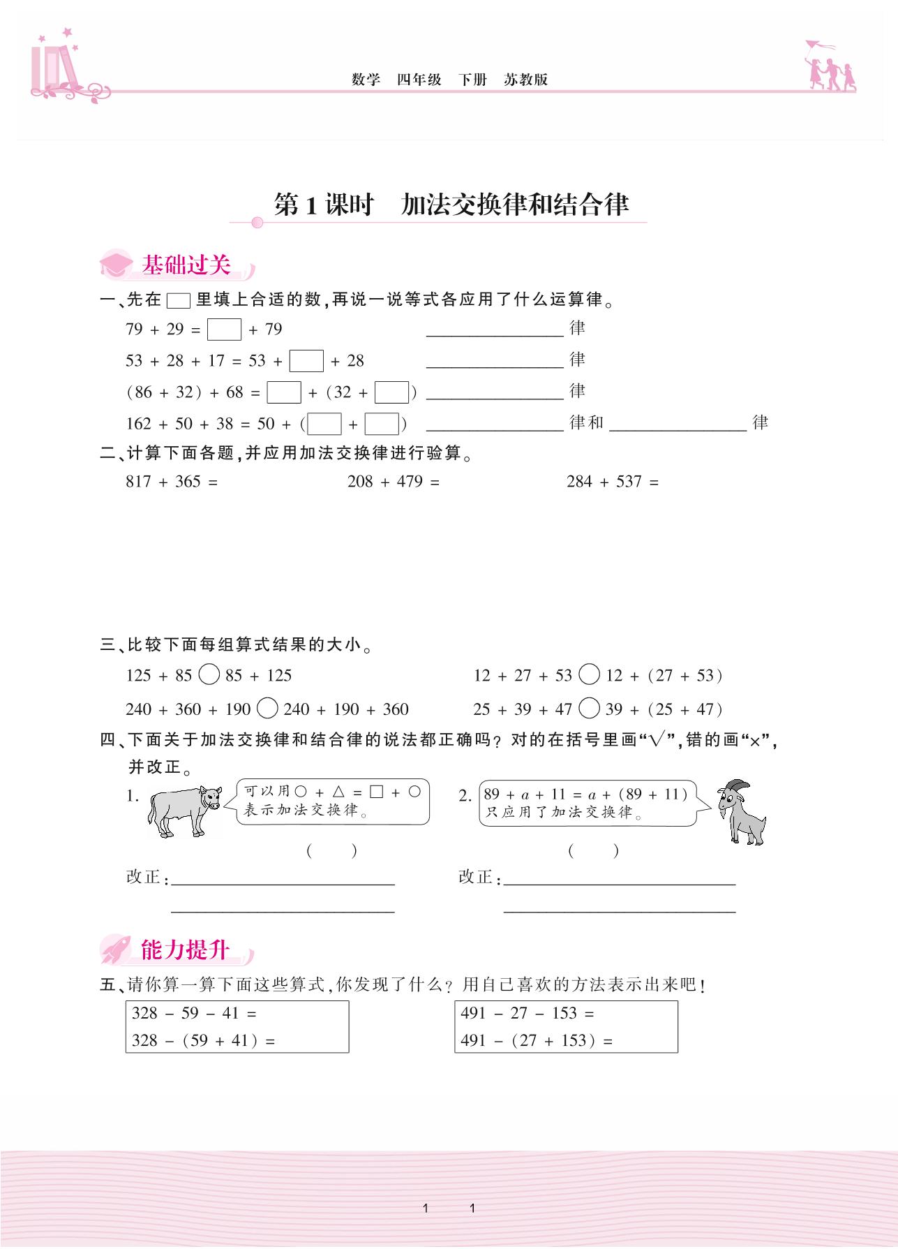 2021下册四年级数学苏教版 六 运算律——第1课时 加法交换律和结合律