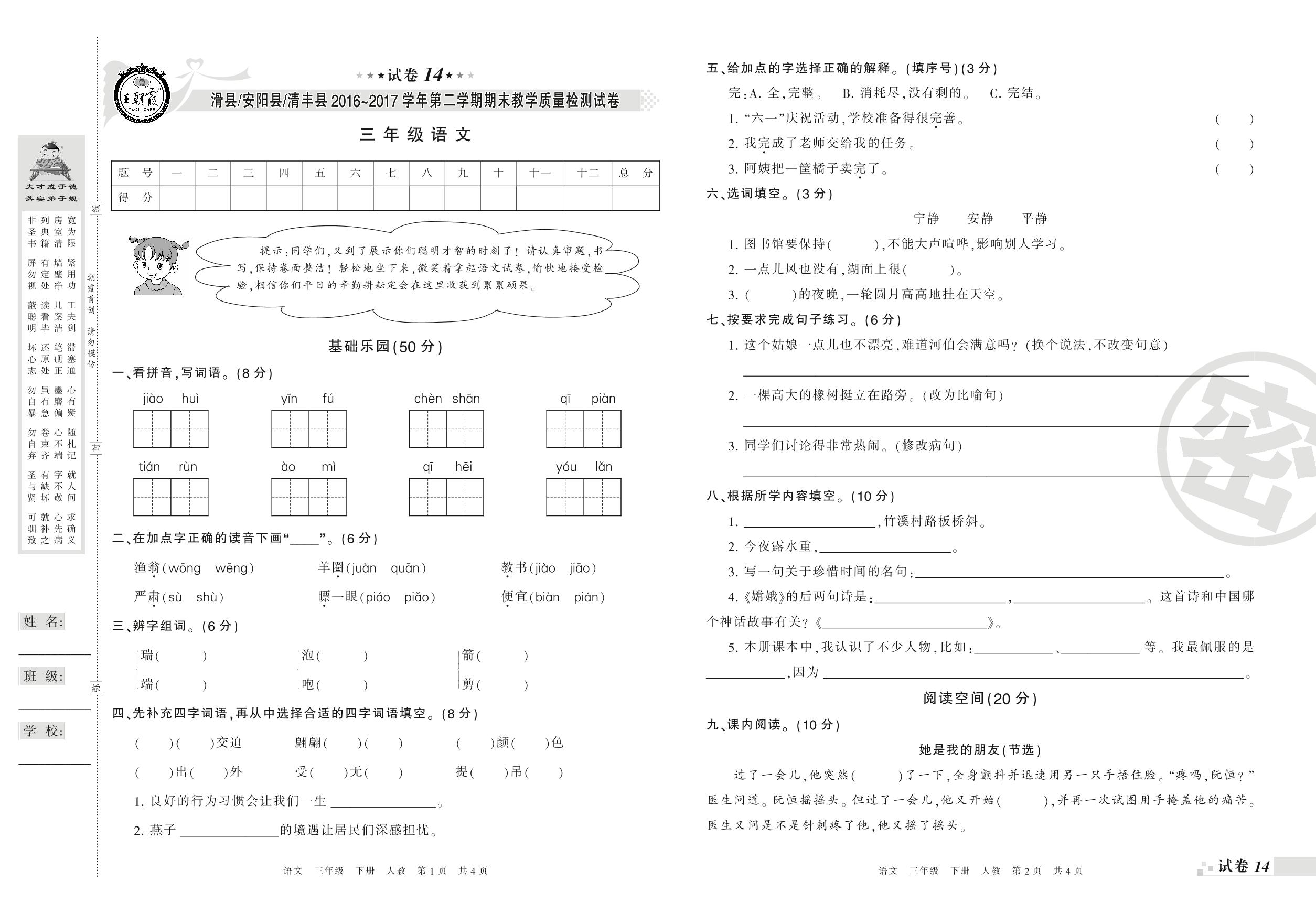 2016-2017学年第二学期安阳市滑县安阳县清丰县三年级语文试卷(人教版)【14】