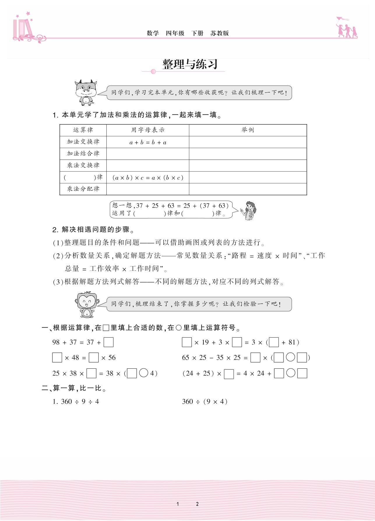 2021下册四年级数学苏教版 六 运算律——整理与练习
