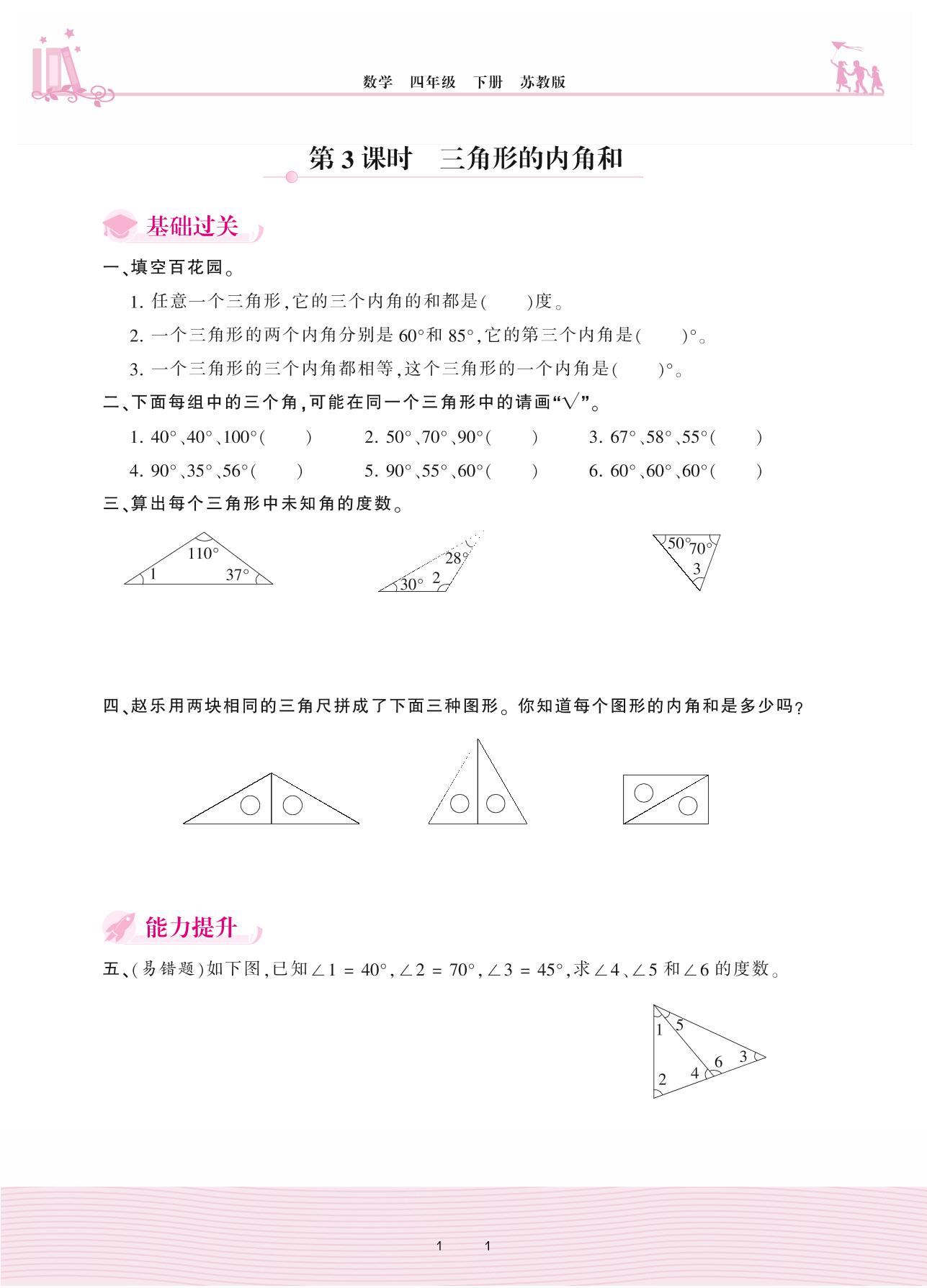 2021下册四年级数学苏教版 七 三角形、平行四边形和梯形——第3课时 三角形的内角和