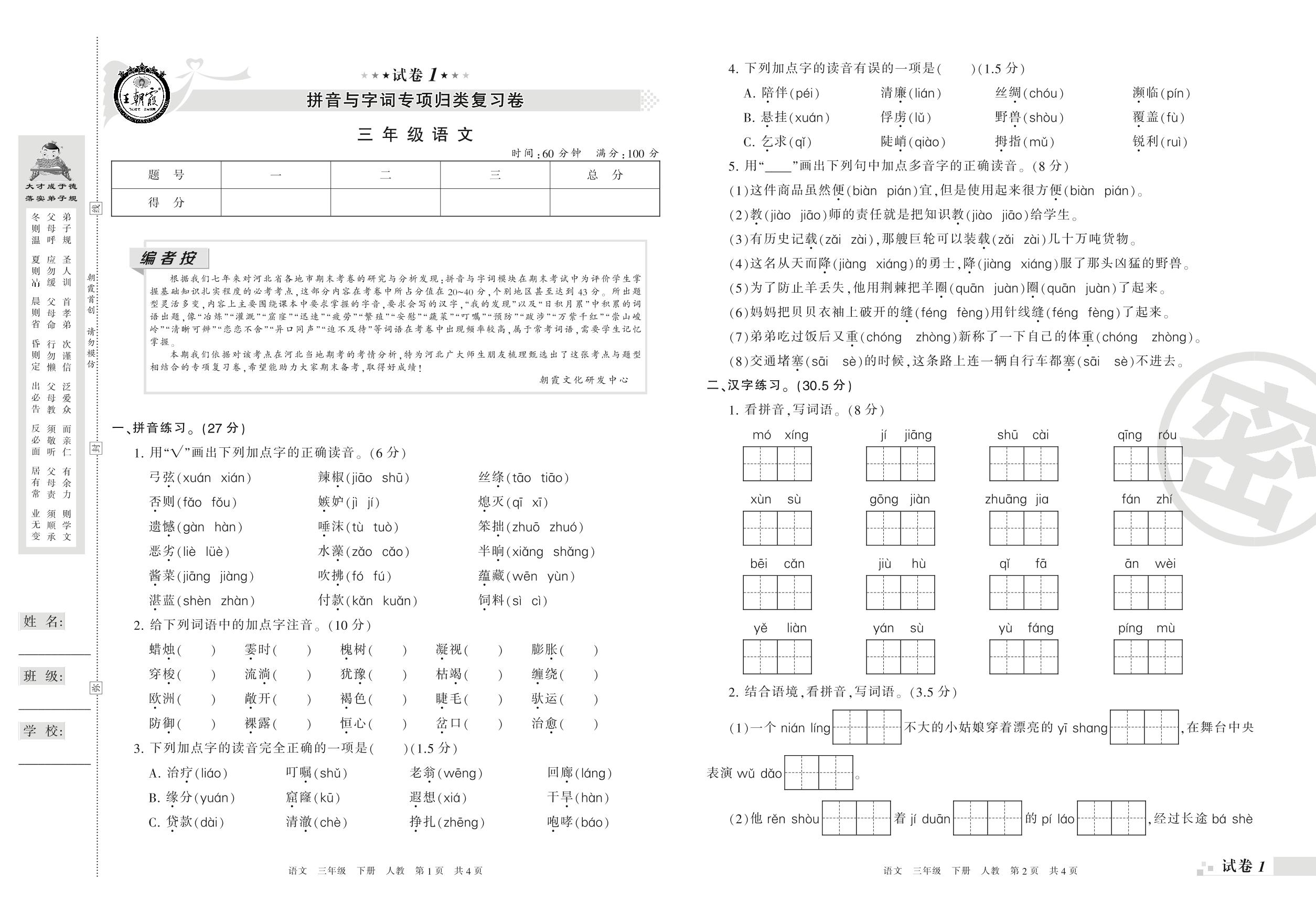 王朝霞期末专项卷——拼音与字词专项归类复习卷三年级下册语文(人教版)_R210801105243【1】
