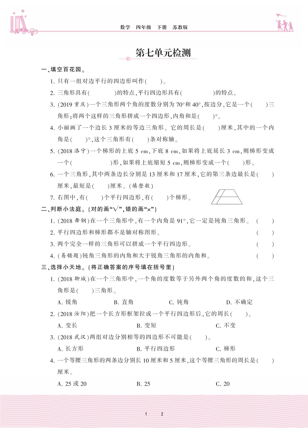 2021下册四年级数学苏教版 七 三角形、平行四边形和梯形——第七单元检测