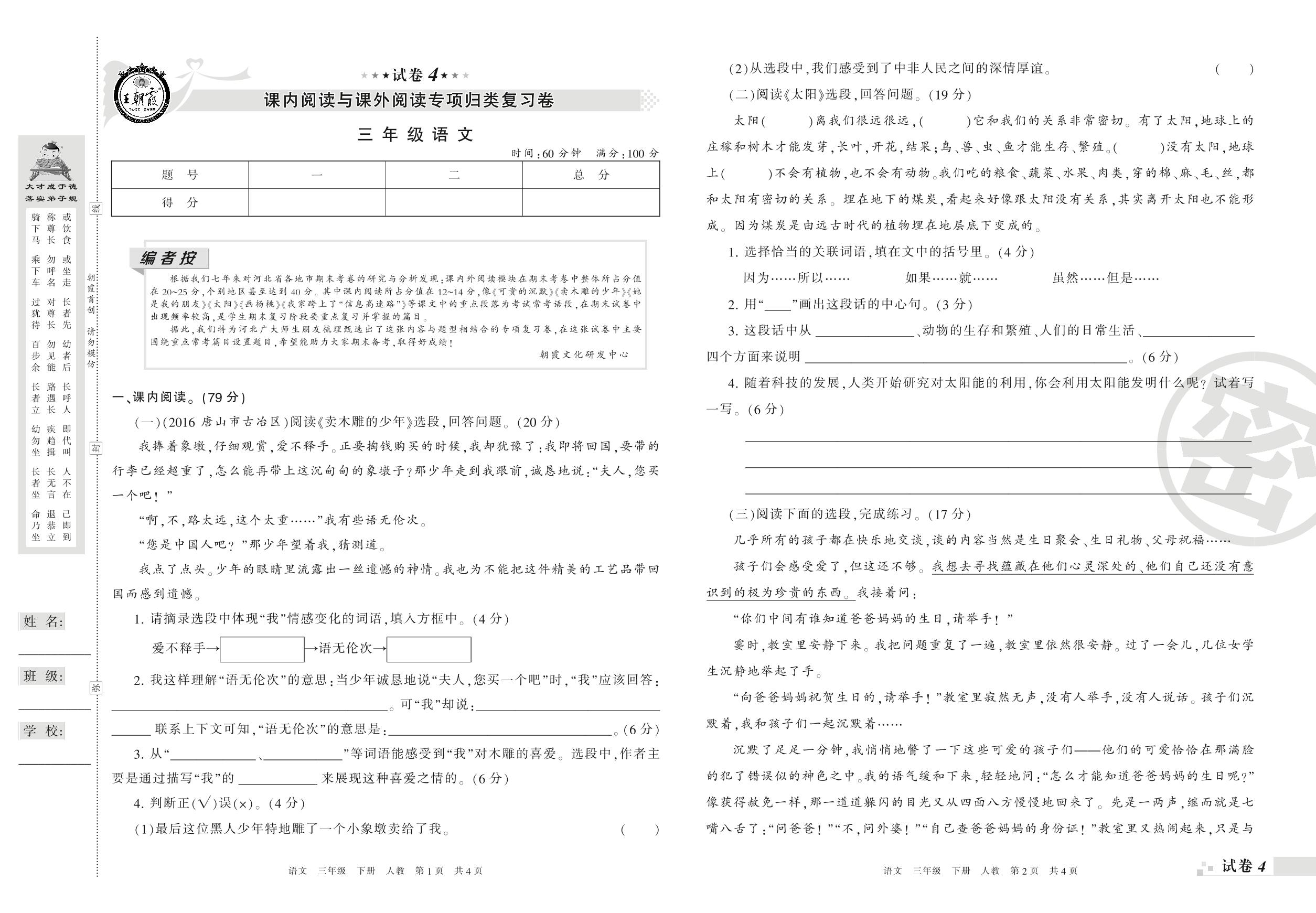 王朝霞期末专项卷——课内阅读与课外阅读专项归类复习卷三年级下册语文(人教版)_R210801105302【4】