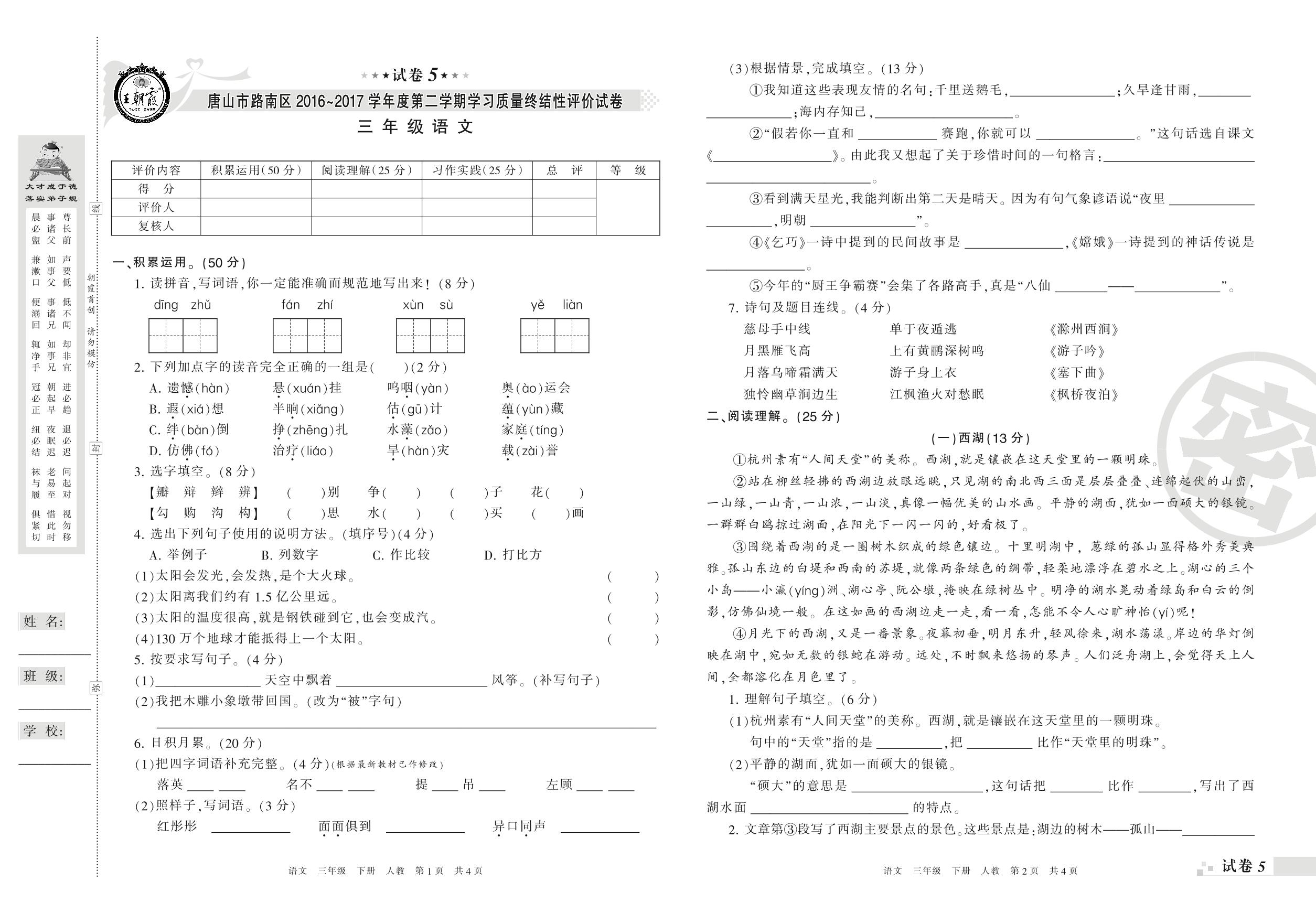 2016-2017学年第二学期唐山市路南区三年级语文试卷(人教版)【5】