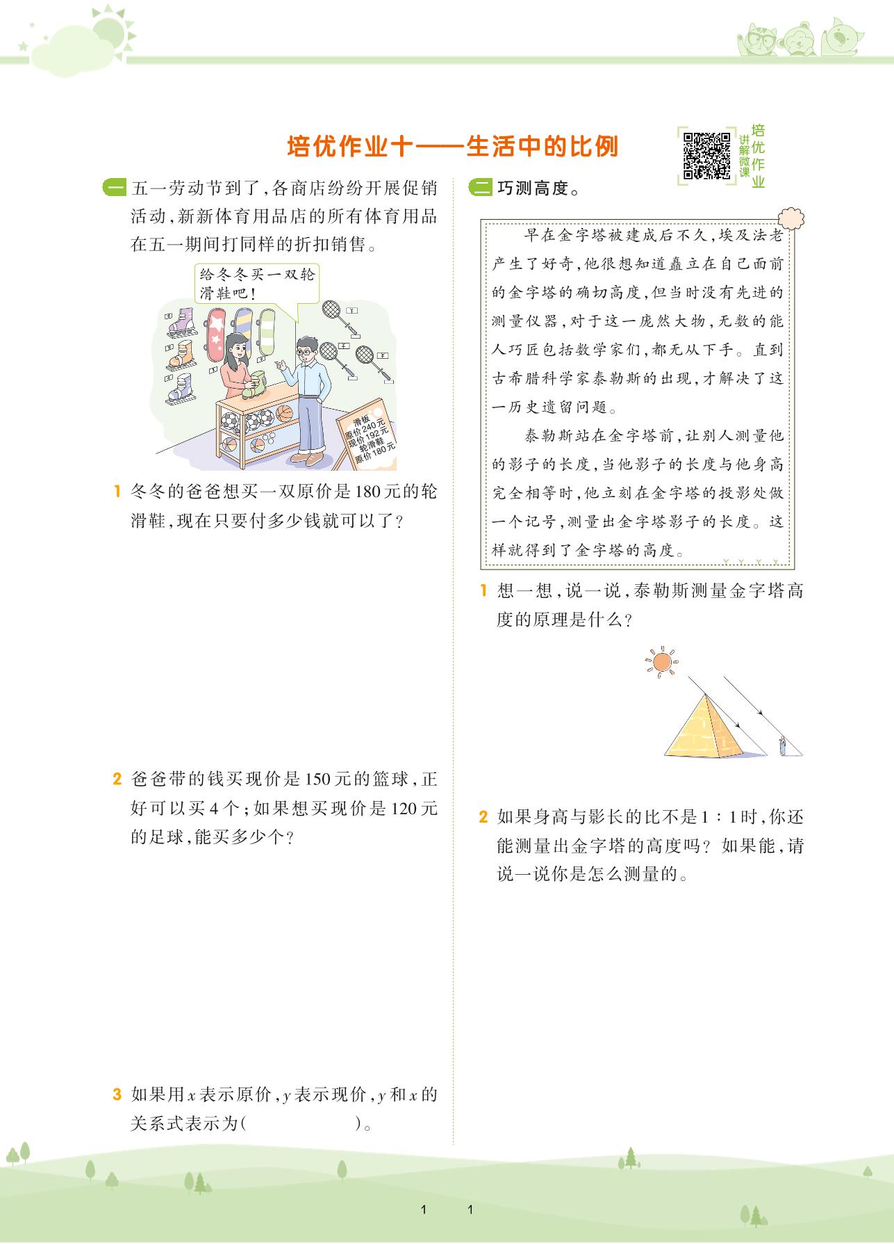 2021下册六年级数学人教版 第四单元 比例——培优作业十 生活中的比例