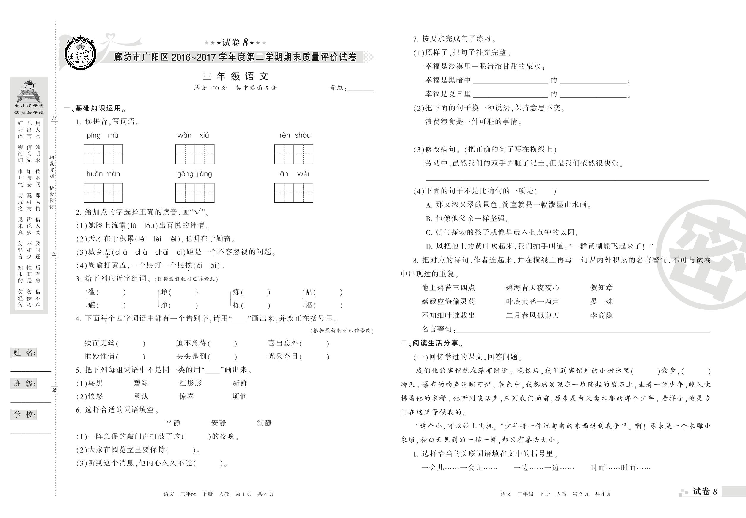 2016-2017学年第二学期廊坊市广阳区三年级语文试卷(人教版)【8】
